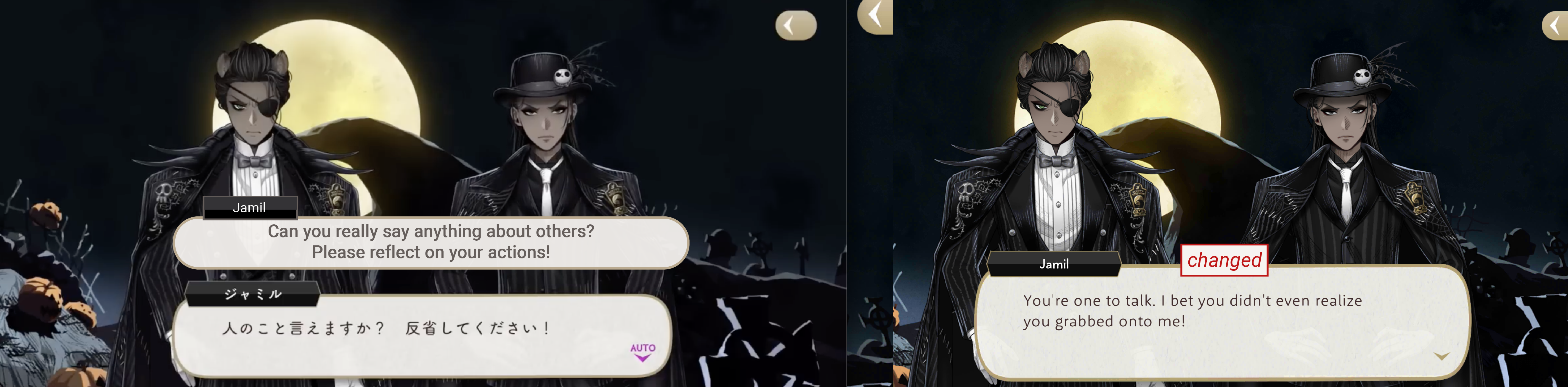 But then they change from saying “him” to “you” on EN, as if addressing Jamil directly while he ignores them. Originally they are still discussing Jamil separately, while he talks with Jack. (Other pronoun mistakes on EN are catalogued here ▶︎ )