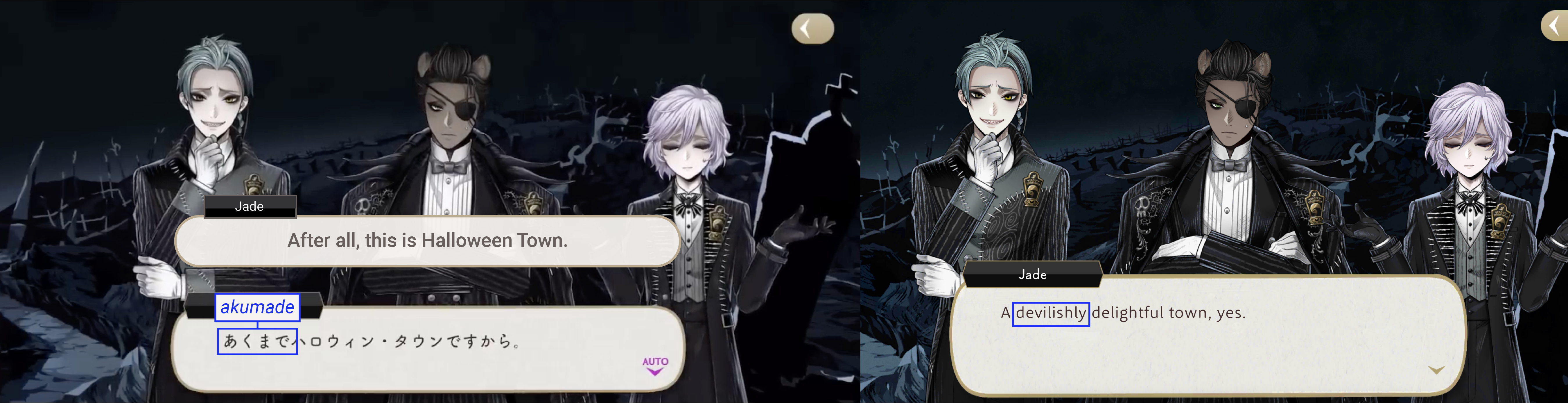 In what was possibly an easter egg from Yana, Jade says a line close to “After all, this is Halloween Town” using the word akumade. Written in hiragana akumade can mean things like “after all,” “ultimately,” “simply,” etc., but it can also be written in kanji as 悪魔で, retaining the same pronunciation while changing the meaning to, “as a demon.”
