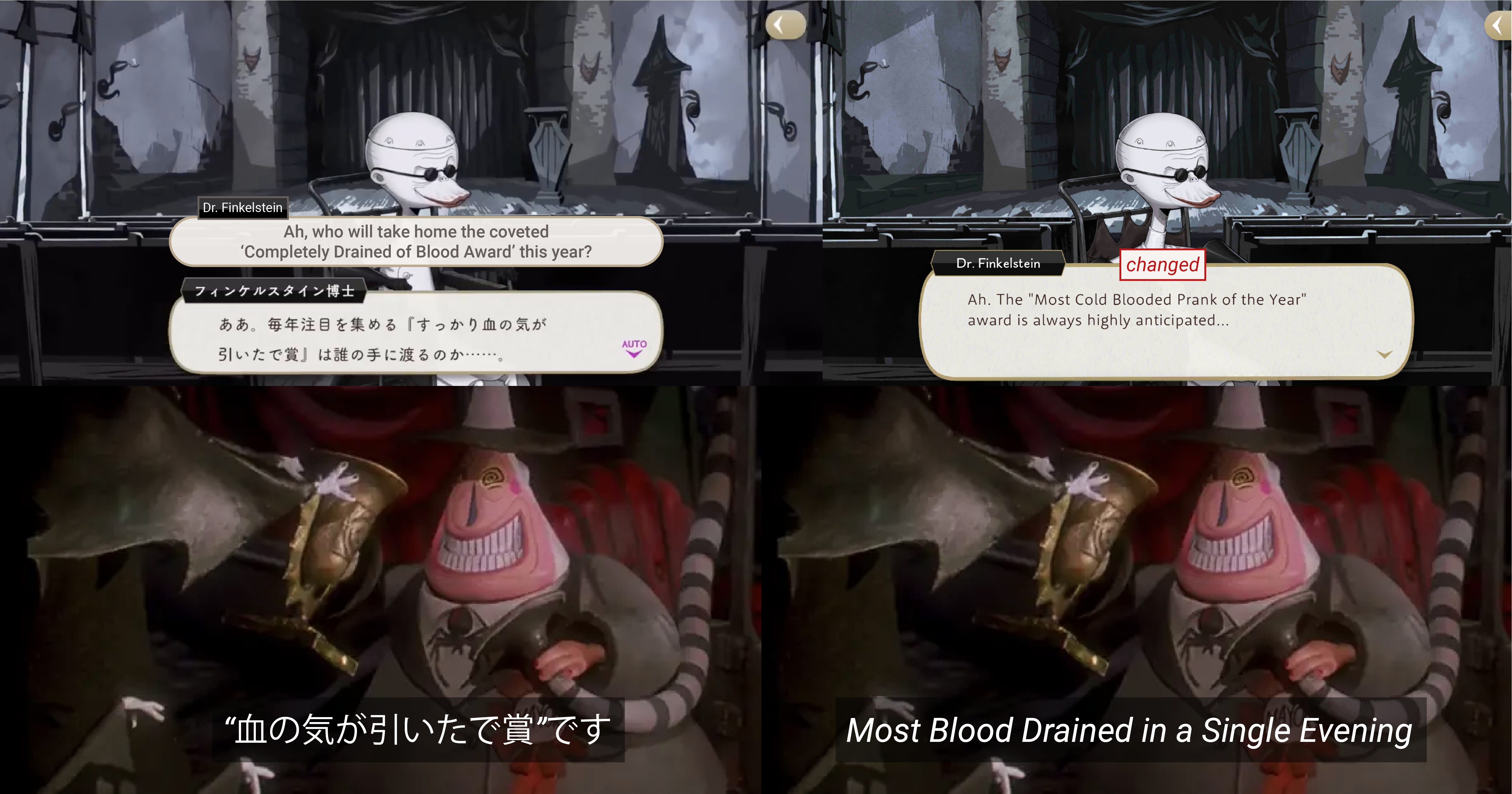 This line in the original game came directly from the Japanese-language translation of Nightmare Before Christmas where the mayor gives an award for “Most Blood Drained in a Single Evening.” Rather than use the line from the original movie, EN changed it to “Most Cold Blooded Prank of the Year Award,” instead.