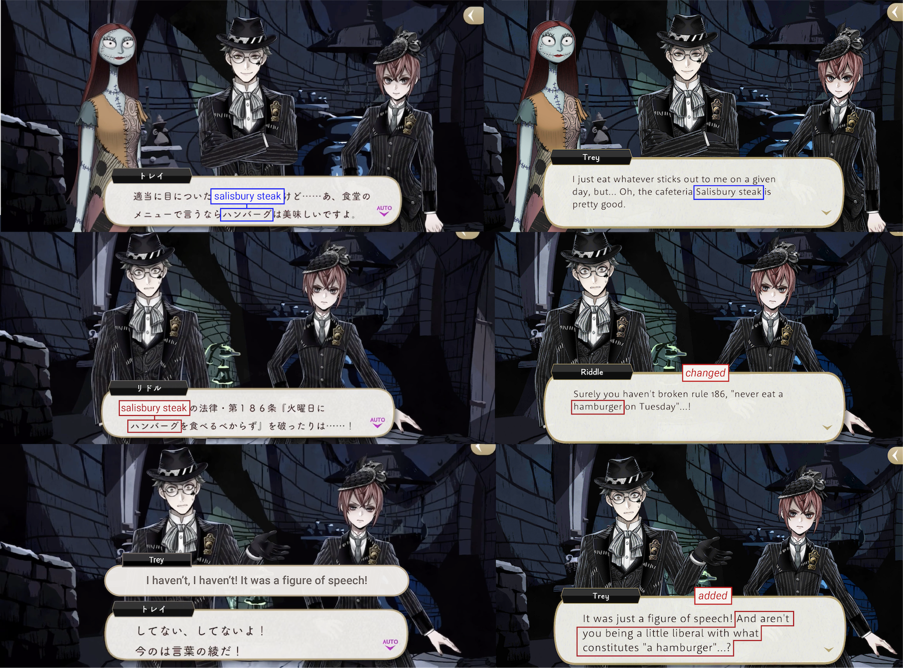 During a conversation between Riddle and Trey about eating Salisbury steak everyday EN-Riddle reminds him that eating “hamburgers” on Tuesdays is against the rules. EN-Trey had the line “And aren’t you being a little liberal with what constitutes ‘a hamburger’…?” added to his dialogue, because the actual rule is not about hamburgers at all: it is and has always been about Salisbury steaks, localized to “hamburger” on EN.