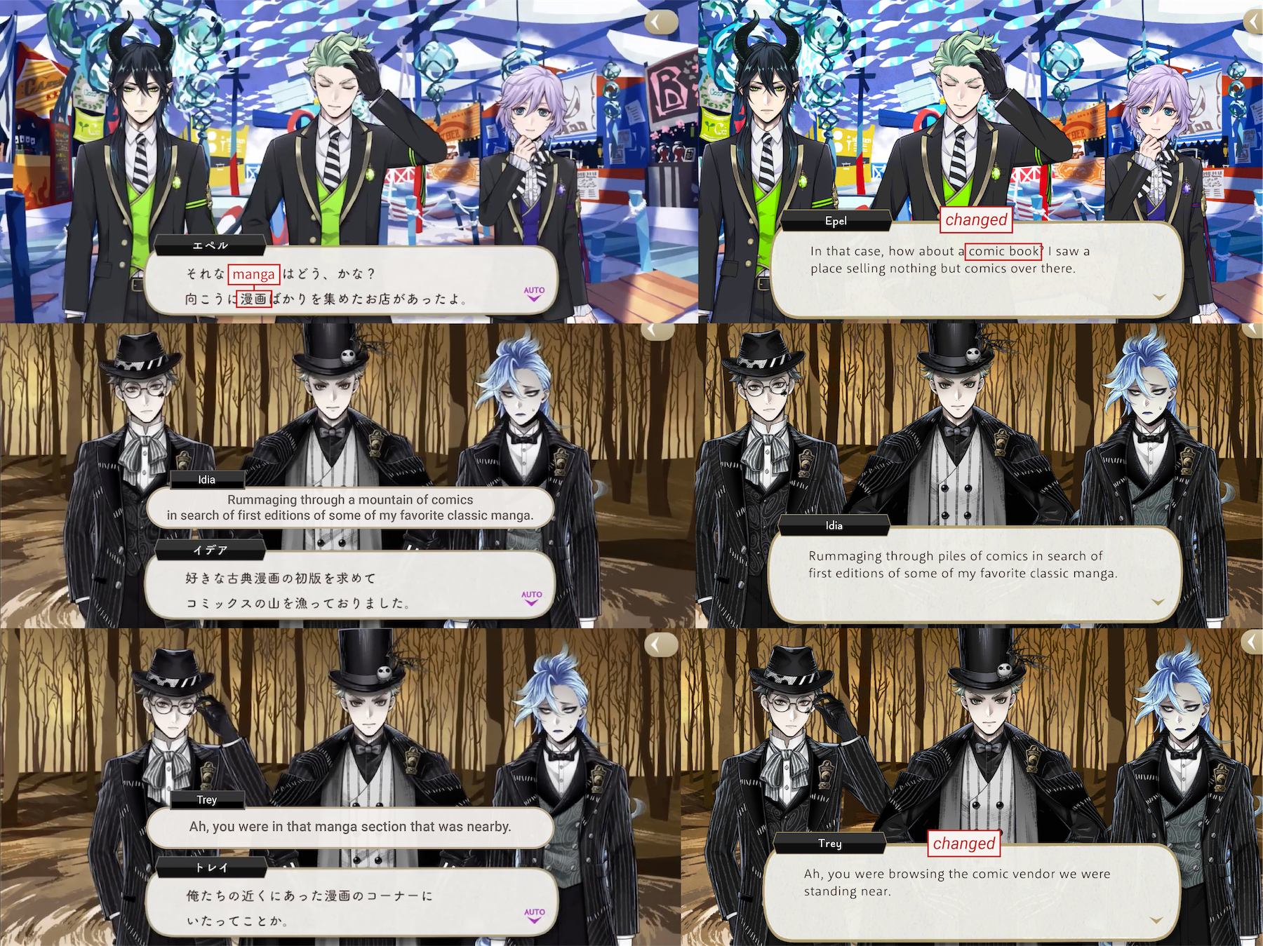 In the original game Idia is in the manga section of the book fair, while on EN he is in the comics section.