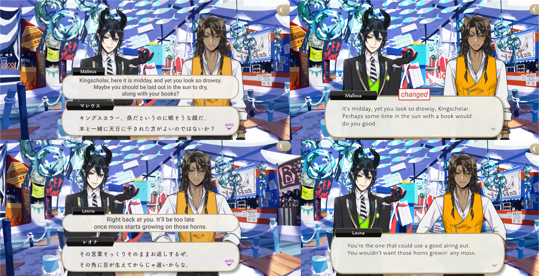 (If you thought it was odd for Leona to suddenly be talking about Malleus needing to dry out, this is why: in his original line Malleus is first to suggest that Leona needs to be dried out, removed from EN.)