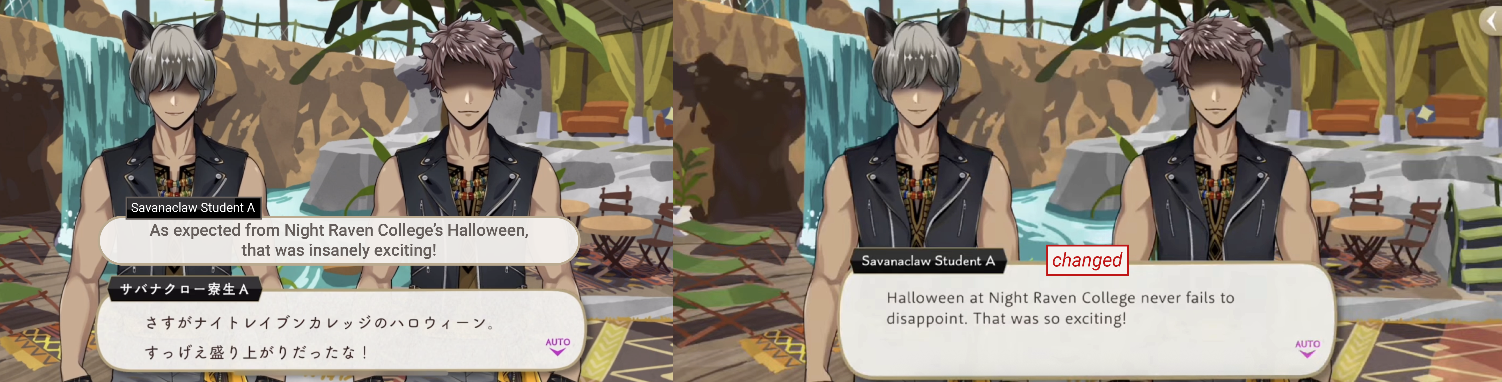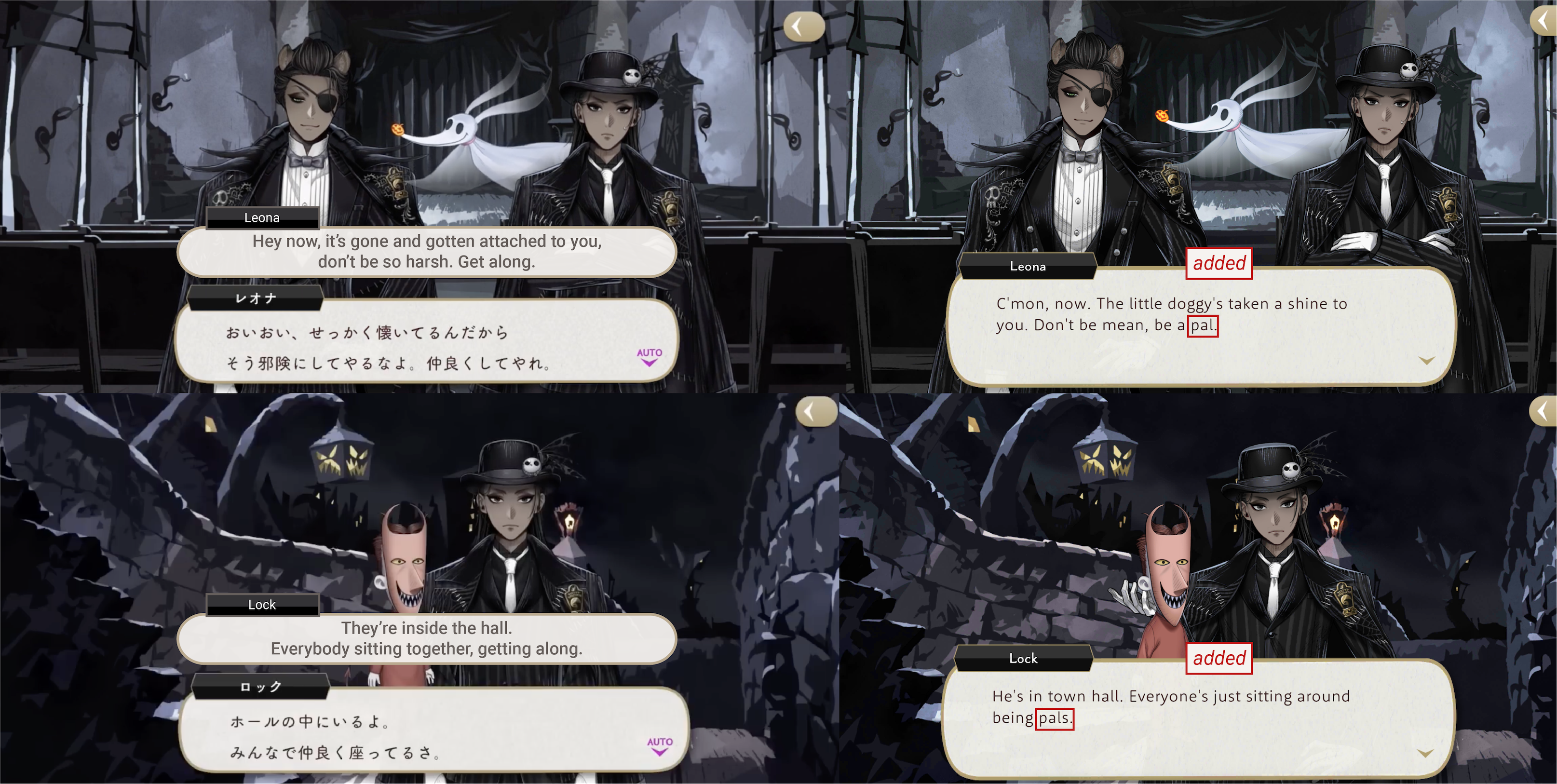 As is common for EN, the word “friend” was added to dialogue multiple times where it was never actually said: Jamil referring to the residents of Halloweentown as Jack’s friends, Jack referring to the students as Skully’s friends, Jack referring to the students as his friends, Barrel calling Leona his friend, Shock calling Skully their pal, Jade commenting on Leona and Zero being friends, Leona commenting on Jamil and zero being friends and Lock commenting on people “sitting around being pals” never happened in the original game.