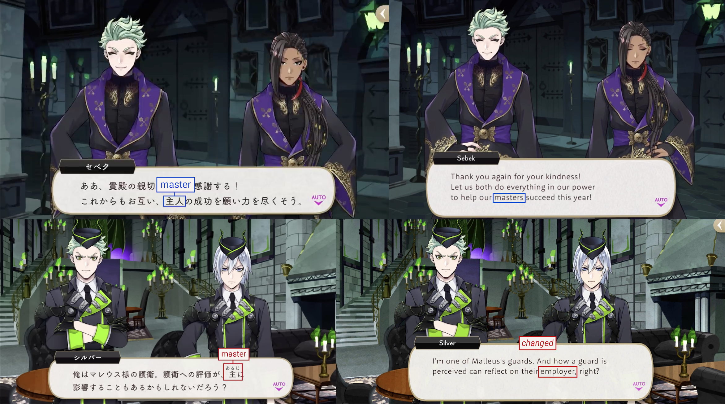 Sebek was originally allowed to refer to Malleus as his master in early vignettes, even using it to refer to Kalim’s relationship to Jamil, but in a more recent example Silver referring to Malleus as their master was changed to “employer.”