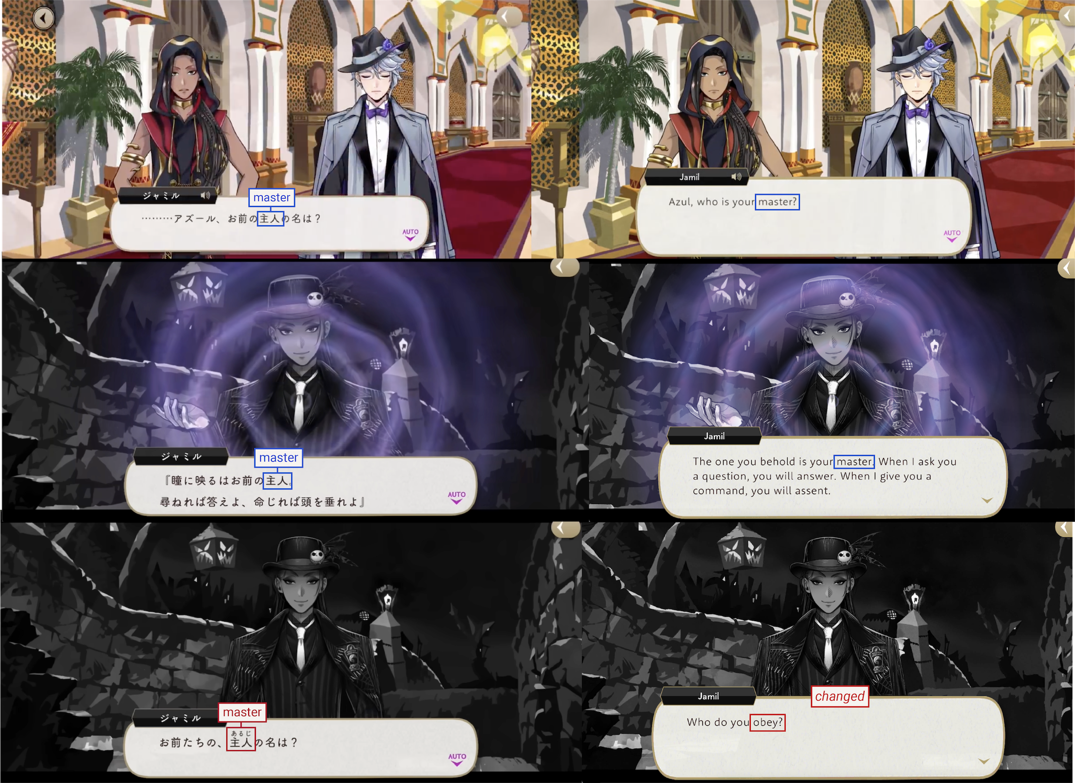 Jamil is allowed to use it as a part of his Unique Magic’s incantation, but his usual follow-up line of “Who is your master?” was changed to “Who do you obey?” on EN for the Nightmare Before Christmas event.