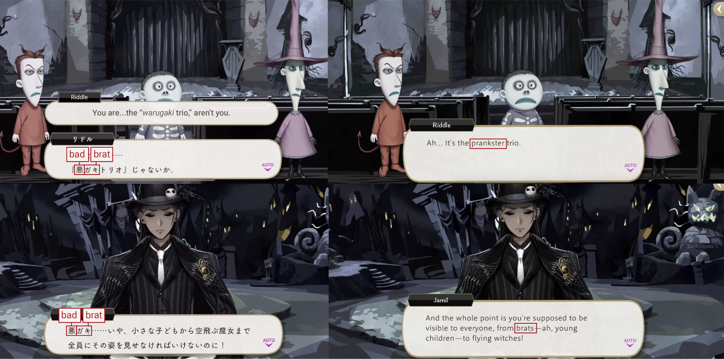 If you also thought it was odd for Jamil to suddenly refer to children as brats, you are again correct: EN took the original name for Lock, Shock and Barrel of “bad brat trio” and localized it as “prankster trio,” which is a perfectly fine adaptation.