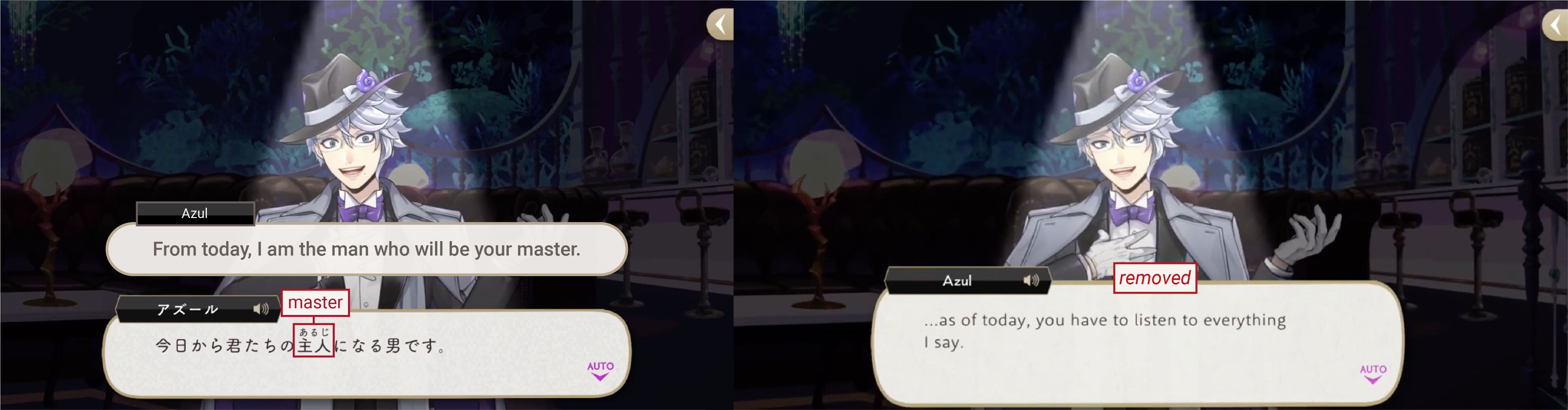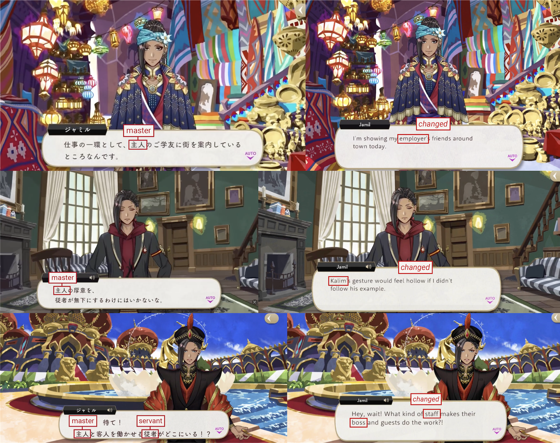 Jamil is not allowed to use the word “master” in reference to Kalim, in which case EN will remove it, rewrite it to “Employer” or “Boss” or, on one occasion, change it to “Hello,” instead.