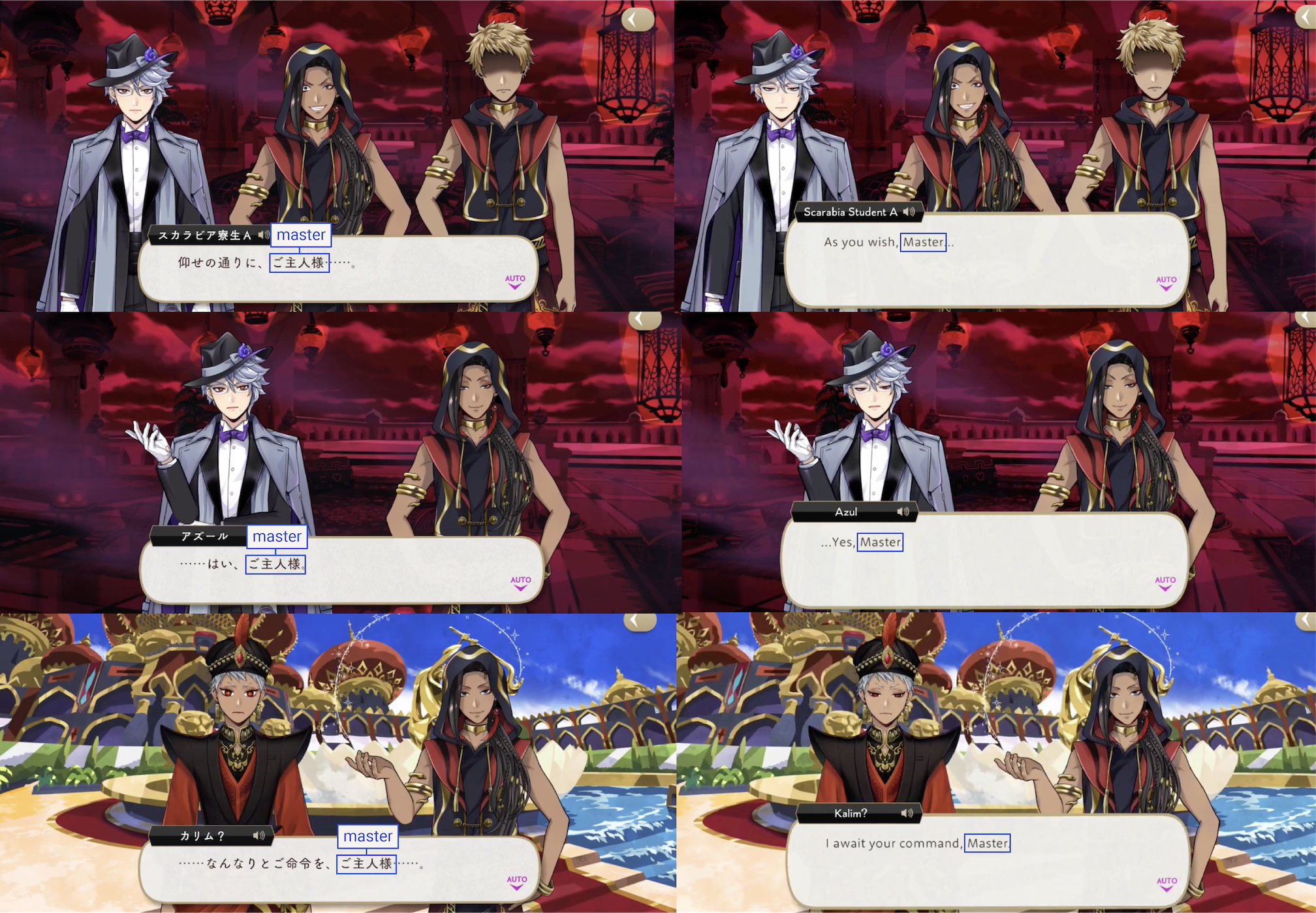 Characters who are allowed to refer to Jamil as “Master” on EN are Azul, a STYX employee, the students of Noble Bell College, Scarabia Students, and a dream version of Kalim in Book 7.