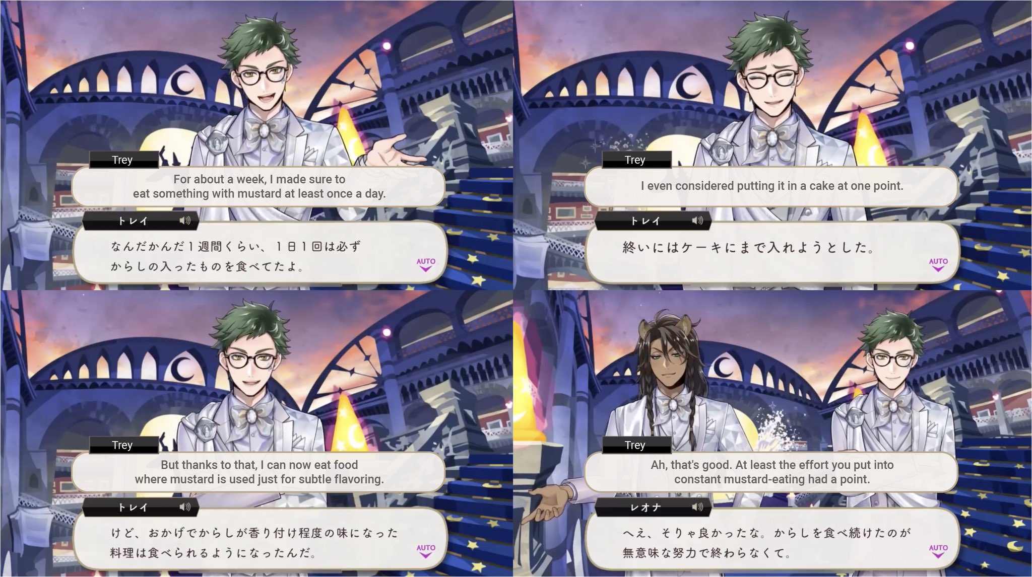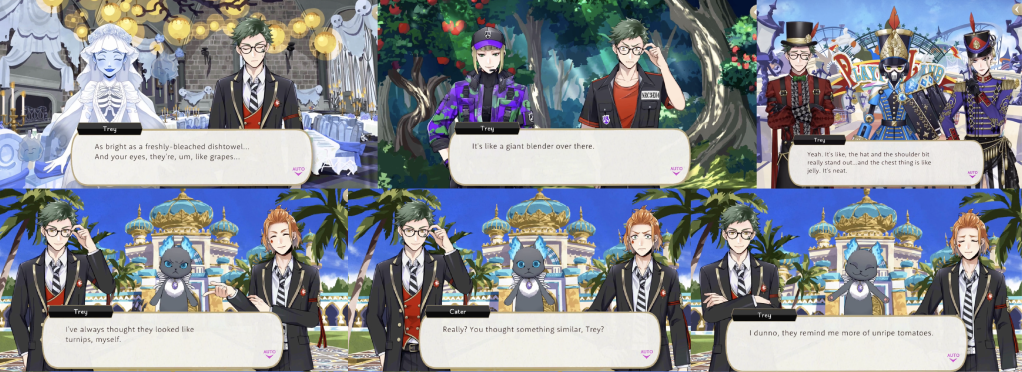 During Phantom Bride he compares Eliza’s veil to a freshly-bleached dish towel and her eyes to grapes. During Beanfest he compares the sight of Floyd and Jack fighting together as being like a giant blender. During the Firelit Sky event he describes Kalim’s home to both turnips and unripe tomatoes. During the Playfulland event he compares an accessory on Ortho’s outfit to jelly.