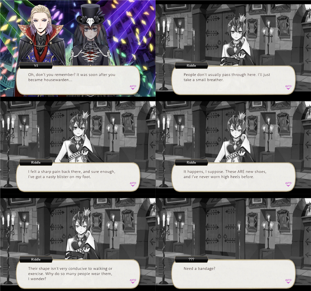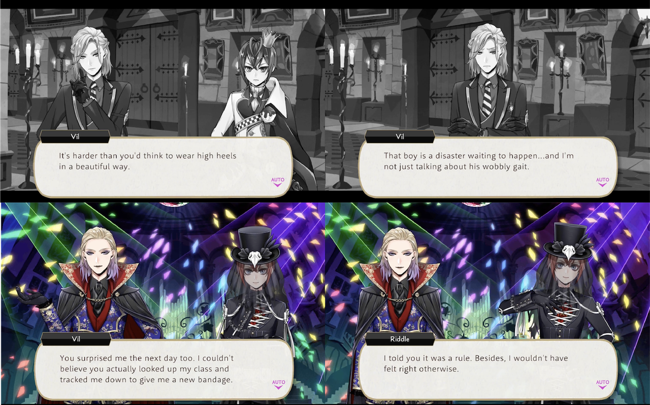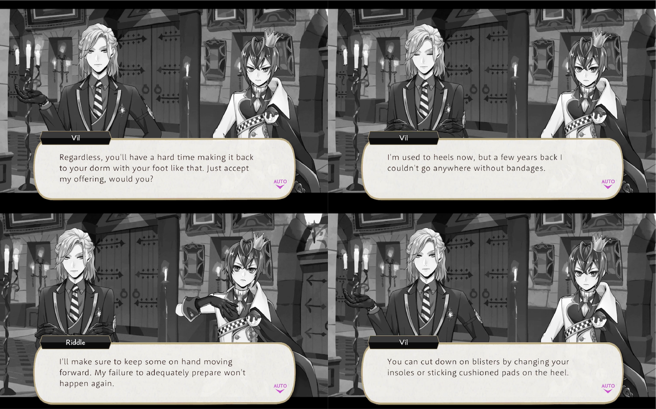 Riddle gets a blister from wearing heels, to which he is unaccustomed. Vil sees him in the hall and provides him with a bandage.