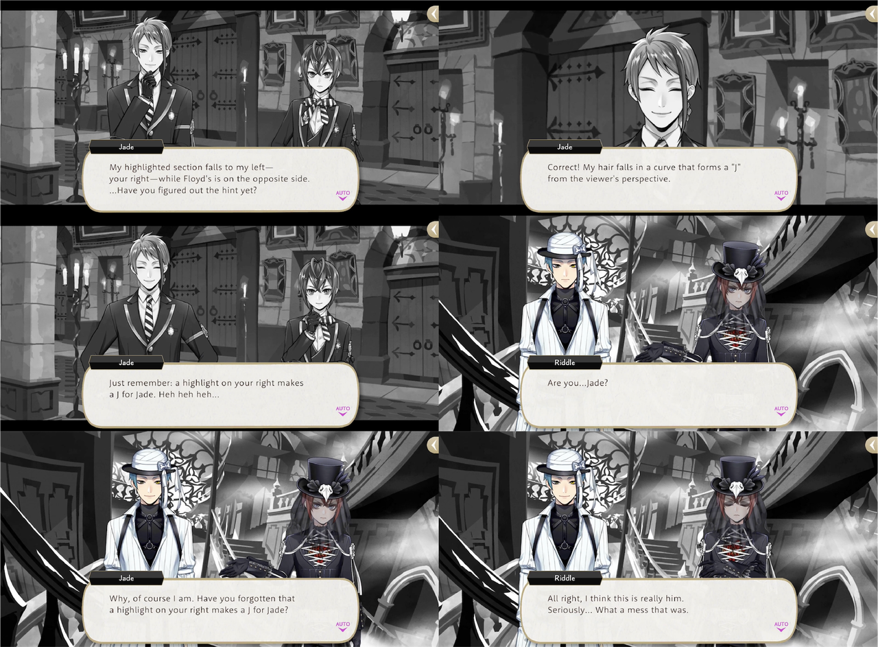 Early in the school year Jade taught Riddle how to tell the difference between himself and Floyd depending upon whether or not his hair forms a “J” from the viewer’s perspective. Jade explains, a highlight on your right makes a J for Jade.