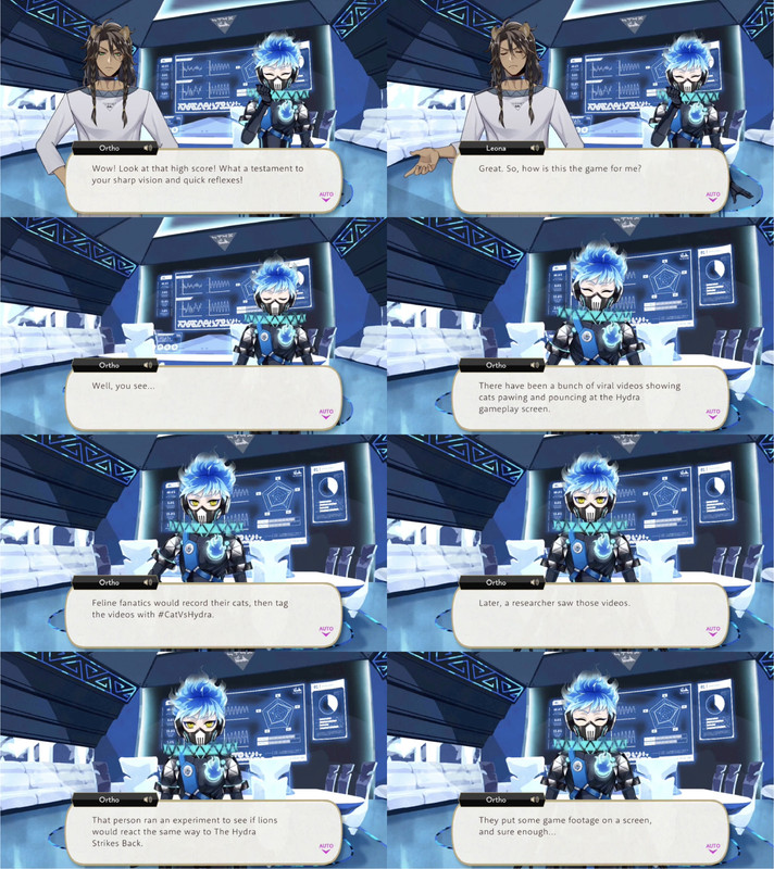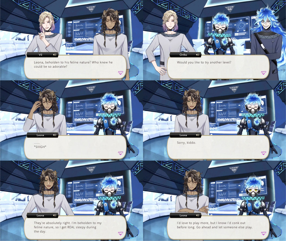 While Leona repeatedly states in-game that he does not like interacting with children he seems to be unusually patient (or at least not outwardly hostile) with Ortho: even when Ortho unintentionally mocks him for his “feline nature,” which leads to Leona being teased by the other students, Leona merely excuses himself from the situation by claiming that he is “beholden to (his) feline nature” and simply must take a nap.