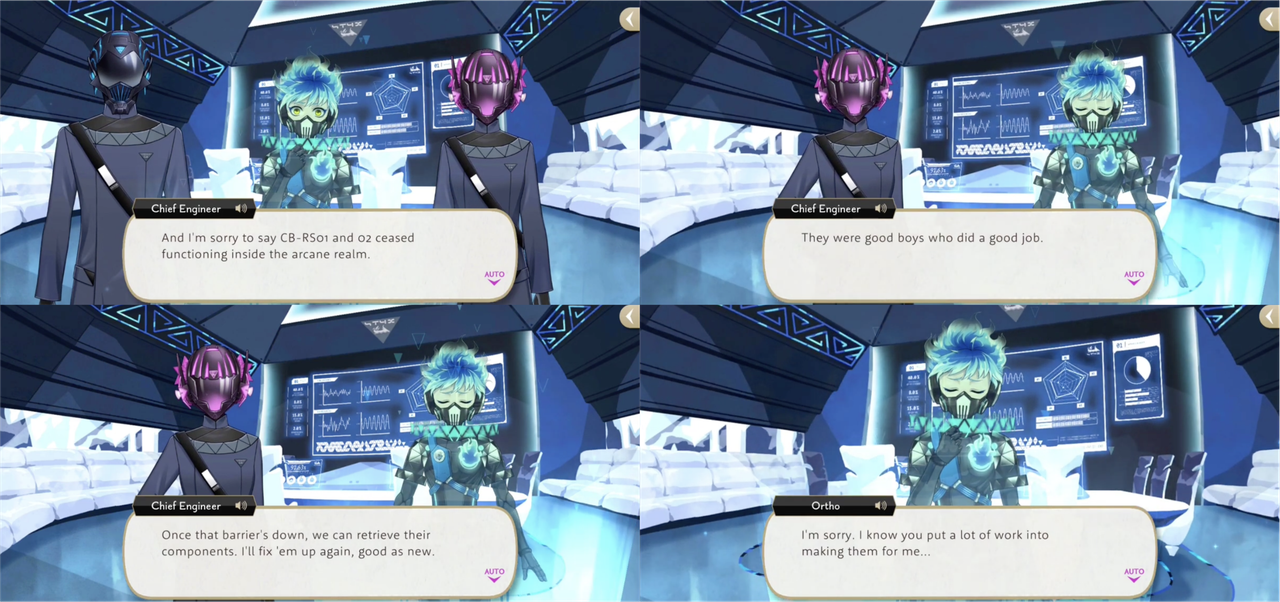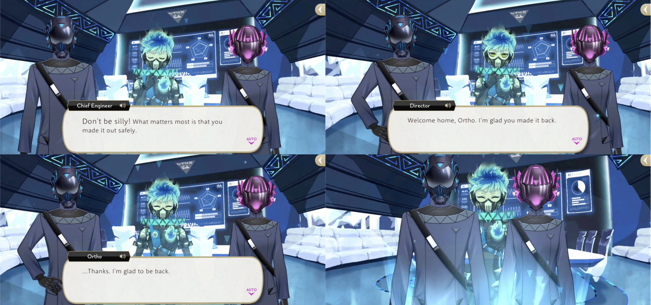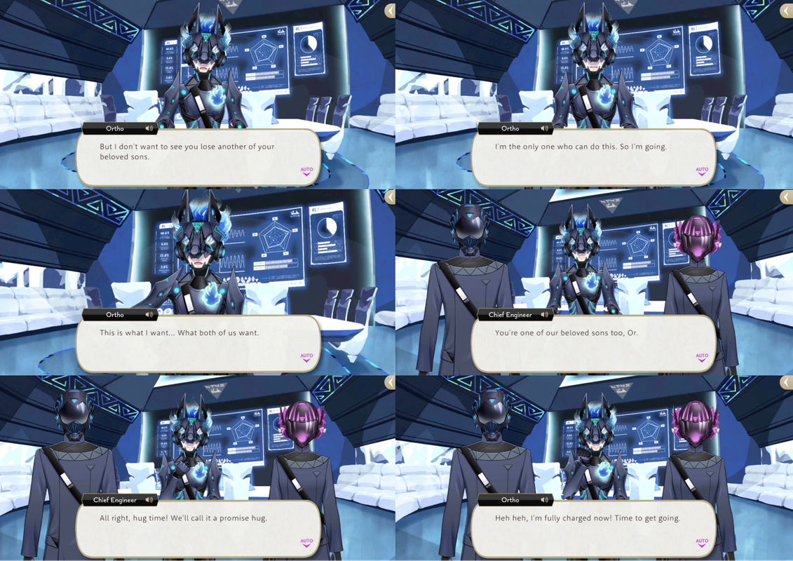 Ortho apologizes for losing the two android dogs that his mother made for him and she responds, “What matters most is that you made it out safely,” saying that she can fix them up again after their components are retrieved. The Director welcomes Ortho home and the family shares another hug.