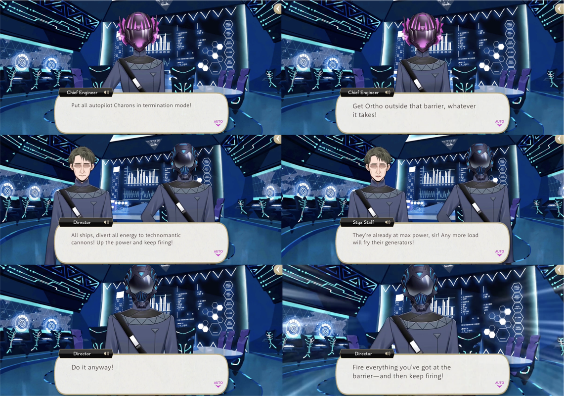 When Malleus starts trying to destroy Ortho his parents respond by putting all the CHARON into termination mode and diverting all energy to their technomantic cannons in order to distract Malleus. When a staff member cautions that they will fry their generators the Director responds, “Do it anyway!”