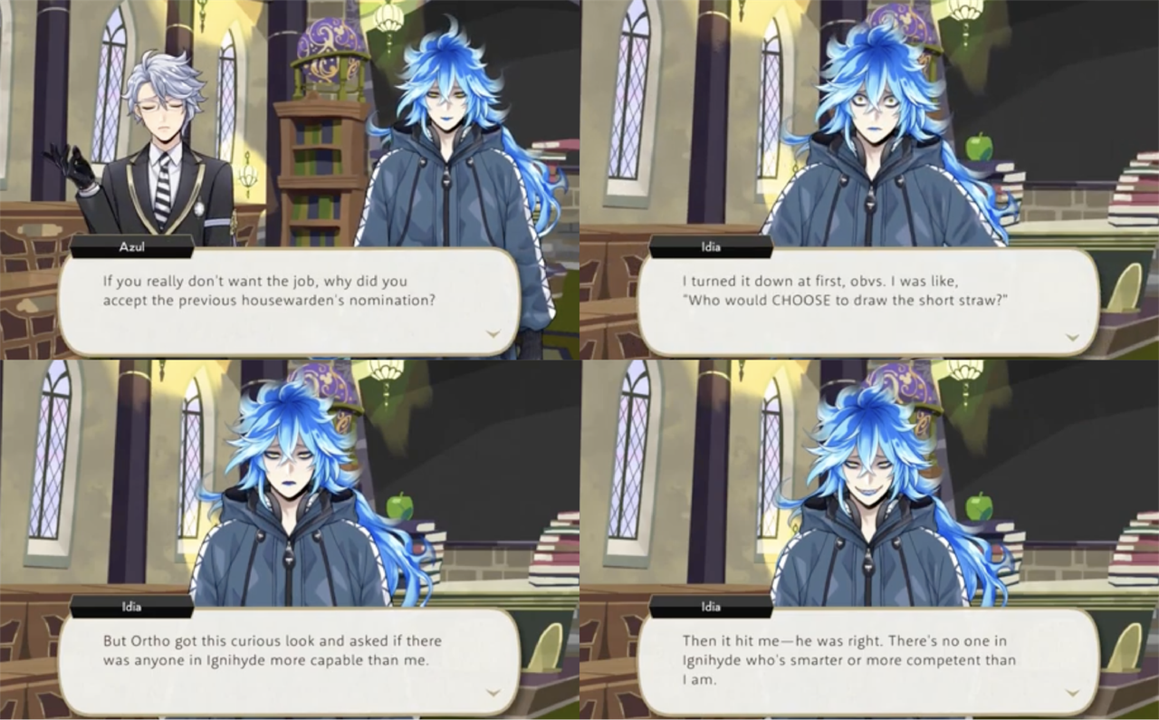 Idia says that he initially turned down the position of Housewarden, but then Ortho asked if there was anyone more capable, and “then it hit me—he was right. There’s no one in Ignihyde who’s smarter or more competent than I am.”