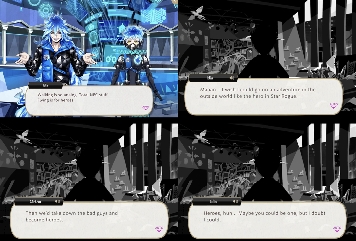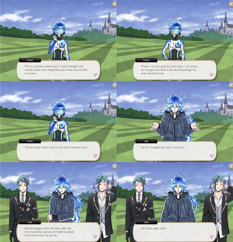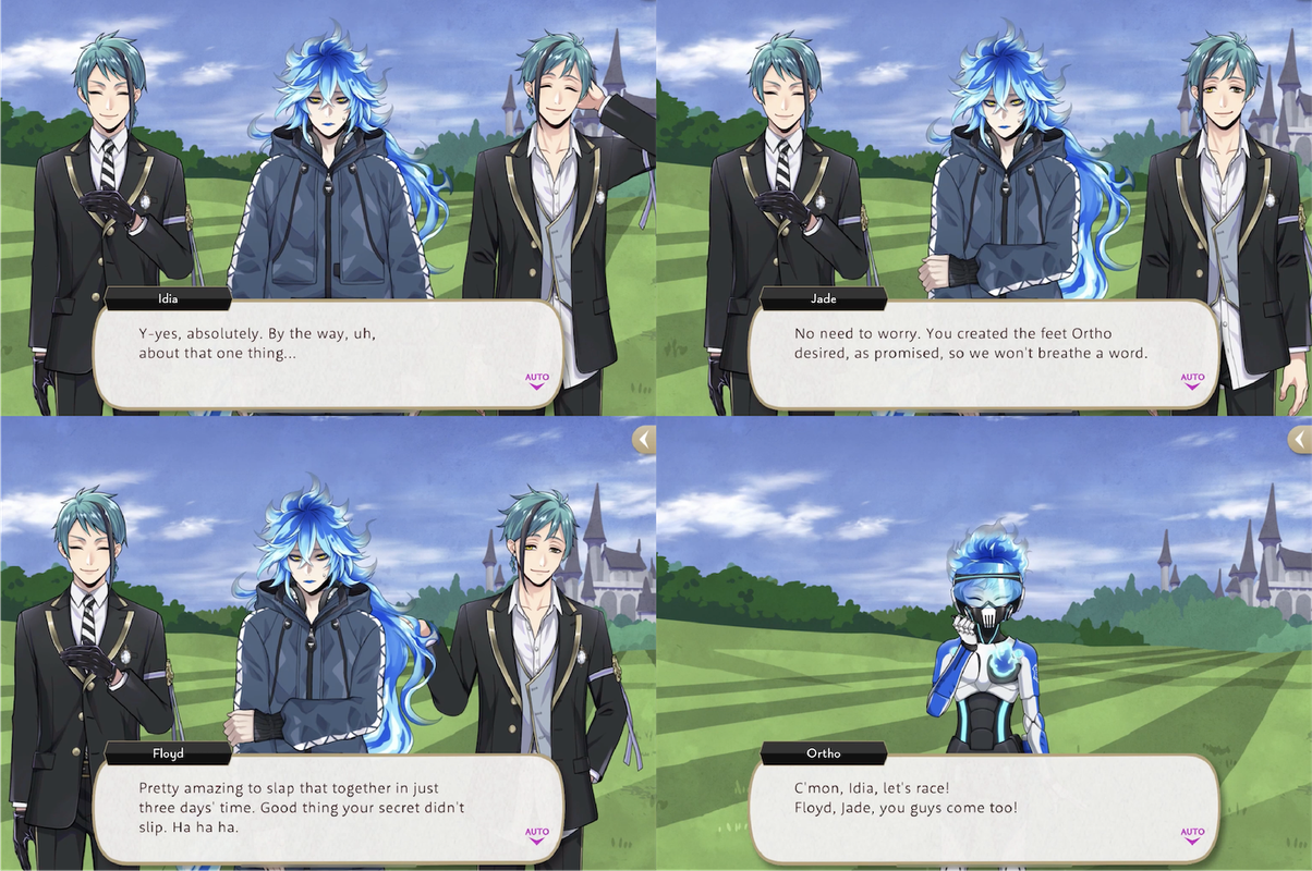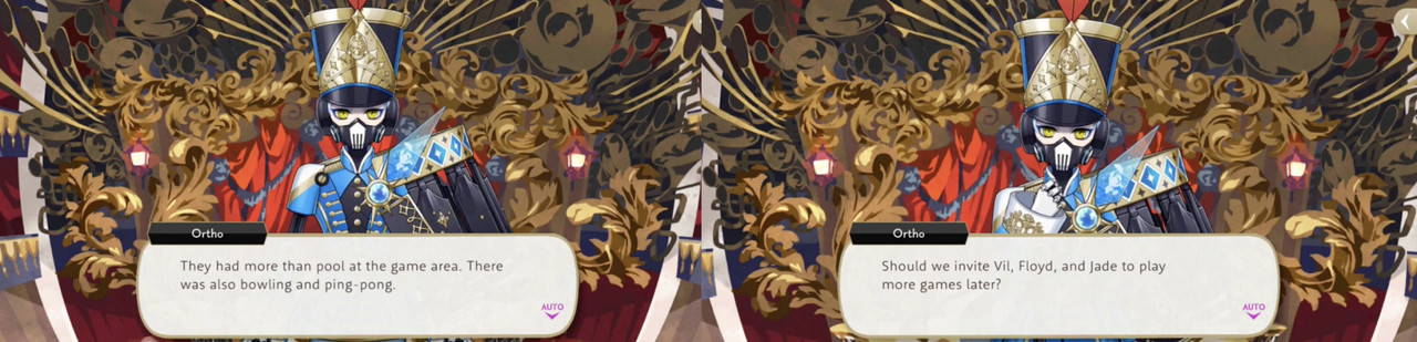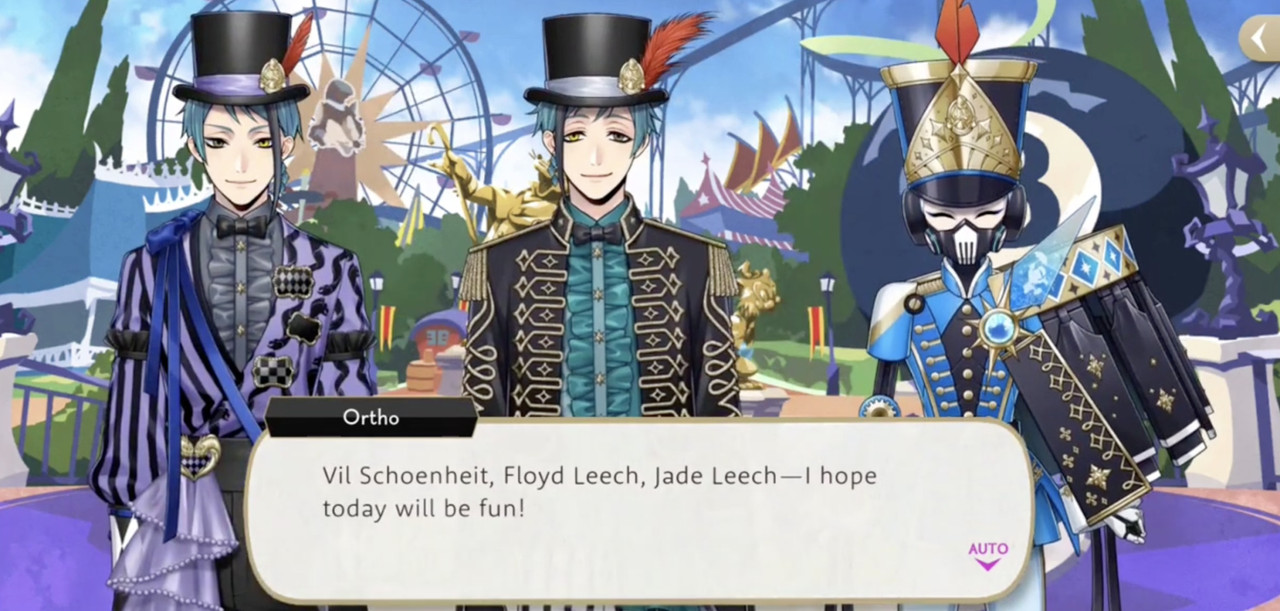 Ortho has additional overlap with Jade and Floyd during Playfulland, joining them in a group with Vil. After the spending part of the day with them Ortho talks about inviting them out again to go bowling and play ping-pong.