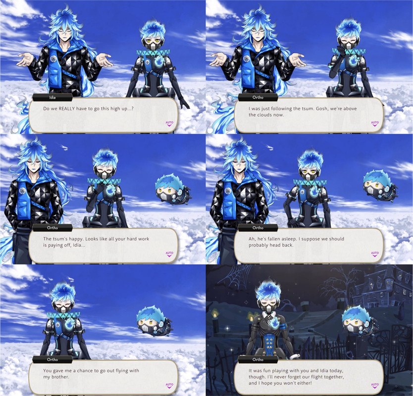 They follows the tsum’s lead, flying above the clouds, and while the tsum is delighted Idia falls asleep mid-flight. Ortho is happy that the tsum gave him the chance to go flying with his brother.