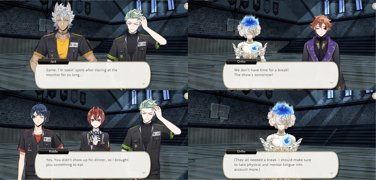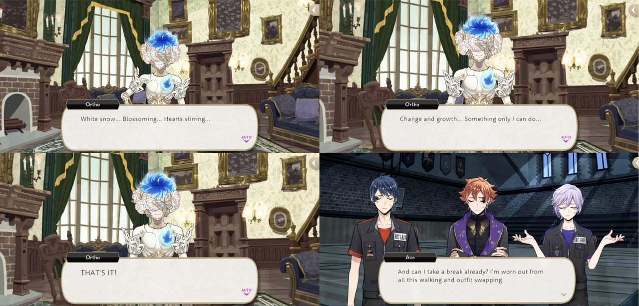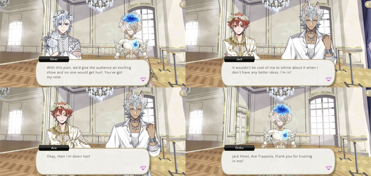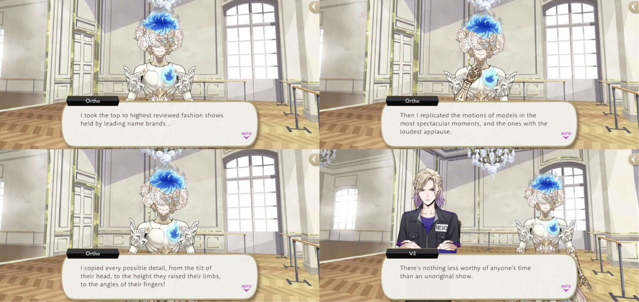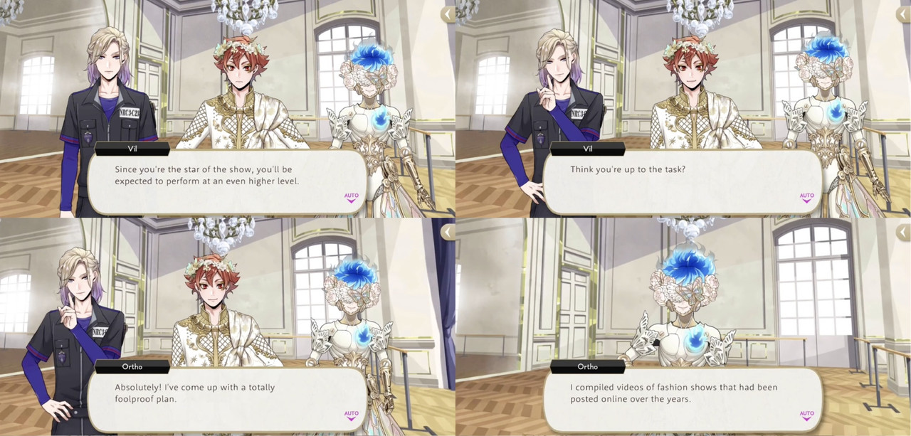Silver, Jack and Ace all agree with Ortho’s plan, but Vil is unimpressed by Ortho’s runway walk, which he devises by replicating the motions of models in videos of past fashion shows.