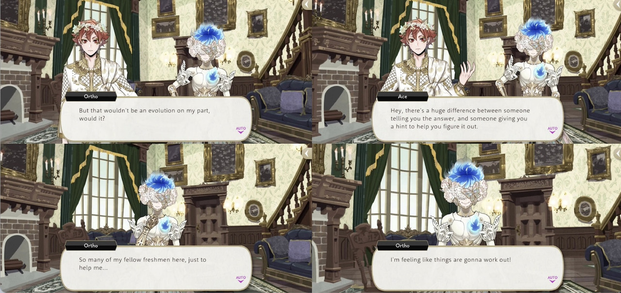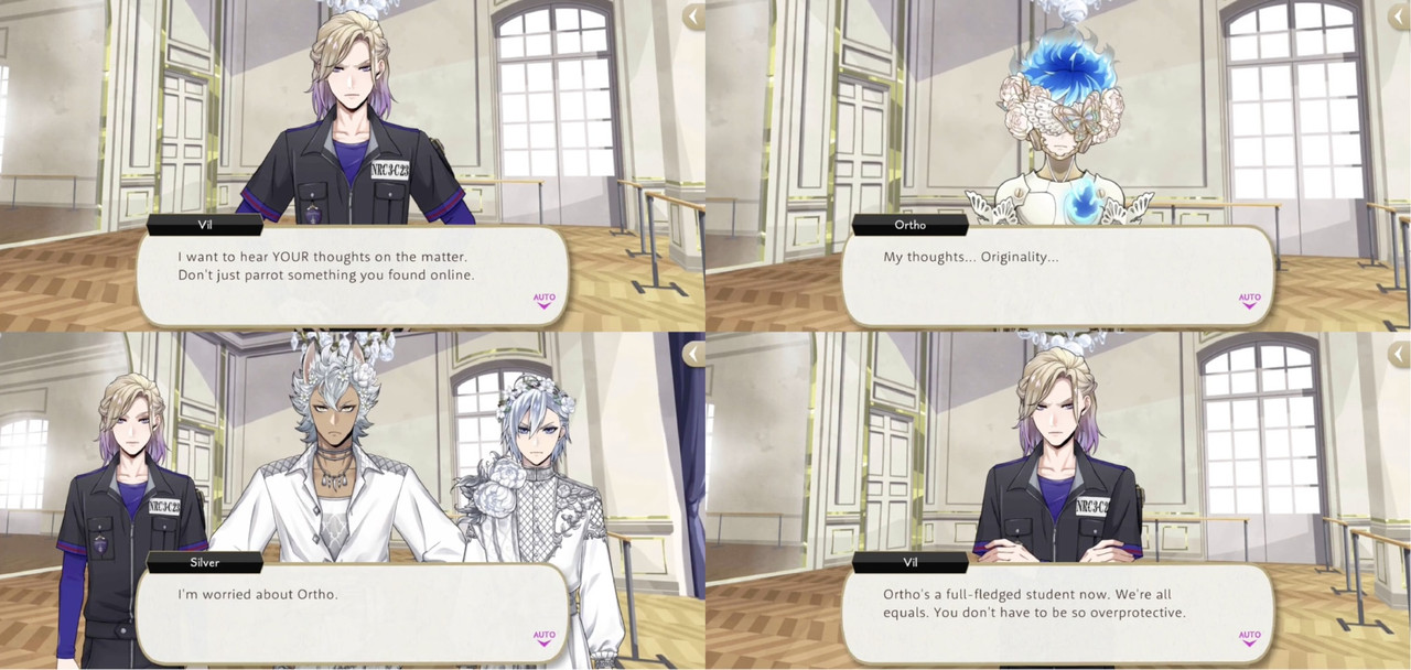 When Ortho is met with the crisis of coming up with an original idea for the fashion show Ace recommends that he discuss the problem with Idia, but Ortho insists he wants to challenge himself: “I don’t want my brother to tell me what I should think.”