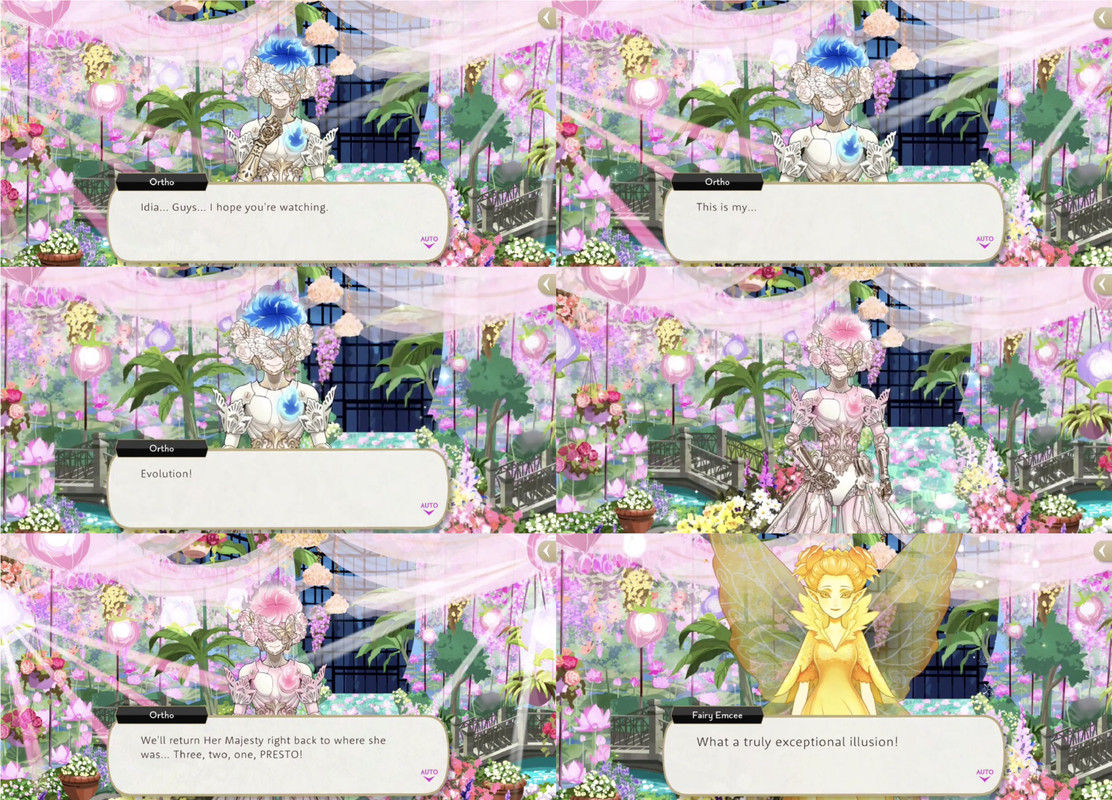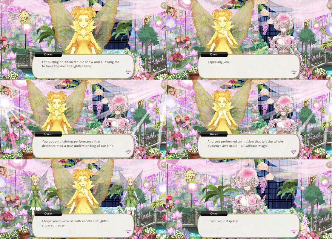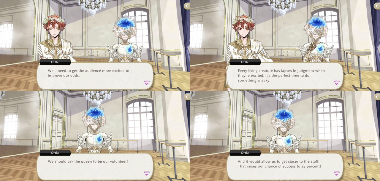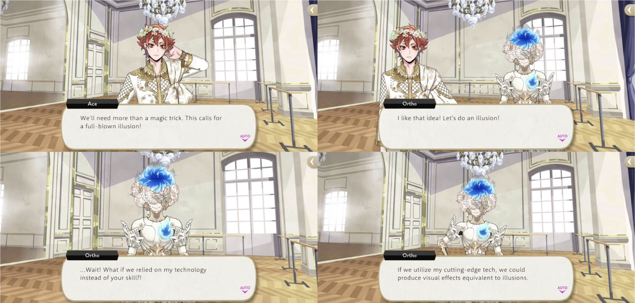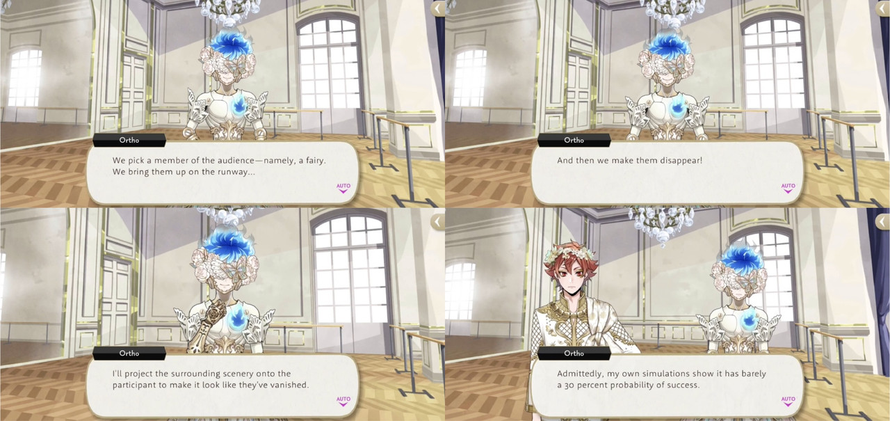 Ortho is the driving force behind Fairy Gala, coming up with the idea of doing an illusion during the event that utilizes his projection mapping abilities and using the Fairy Queen as their volunteer (“Every living creature has lapses in judgement when they’re excited. It’s the perfect time to do something sneaky”).