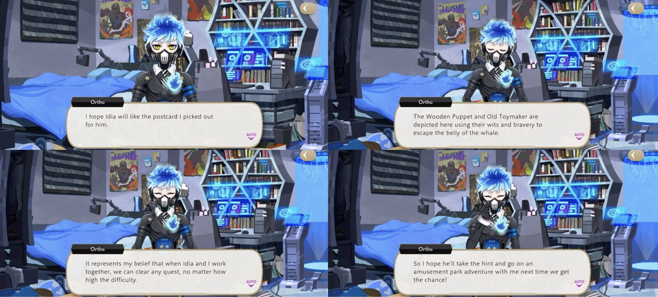 Ortho sends Idia a postcard from Playfulland as a souvenir. Out of all the illustrations available he says he choice a scene that depicted a puppet and toymaker trying to escape the belly of a whale.