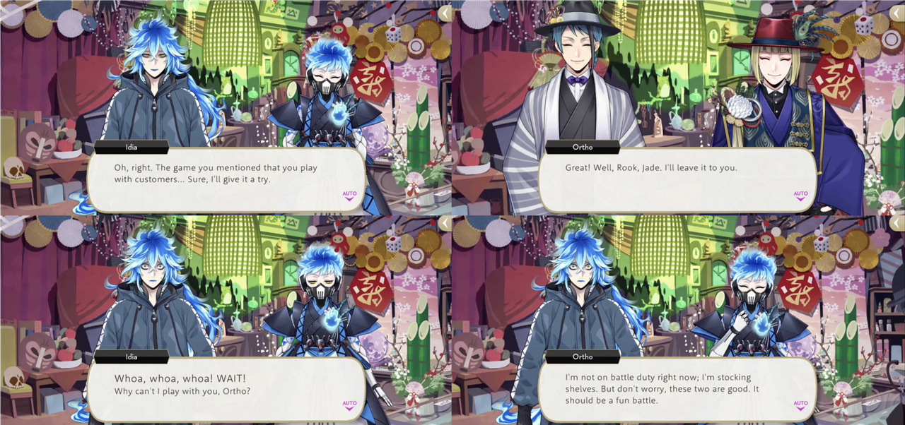 This also happens when Ortho is working at the store himself. Idia agrees immediately under the misunderstanding that he will be able to play with Ortho and he is not pleased about having to go up against Rook and Jade instead.