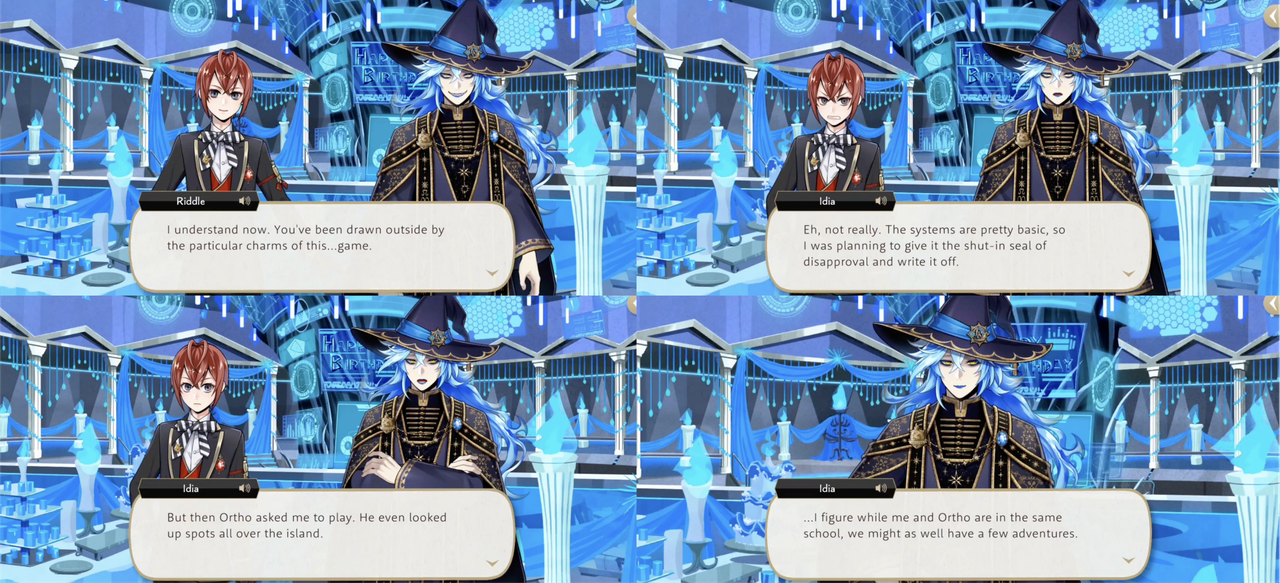 In Idia’s third birthday vignette we learn that he actually isn’t very interested in the game itself at all, saying, “The systems are pretty basic, so I was planning to give it the shut-in seal of disapproval and write it off. But then Ortho asked me to play. He even looked up spots all over the island. When I learned I could play without going THAT far, I was like…yeah, okay…I figure while me and Ortho are in the same school, we might as well have a few adventures.”