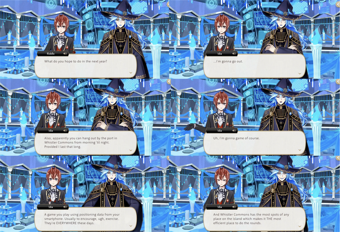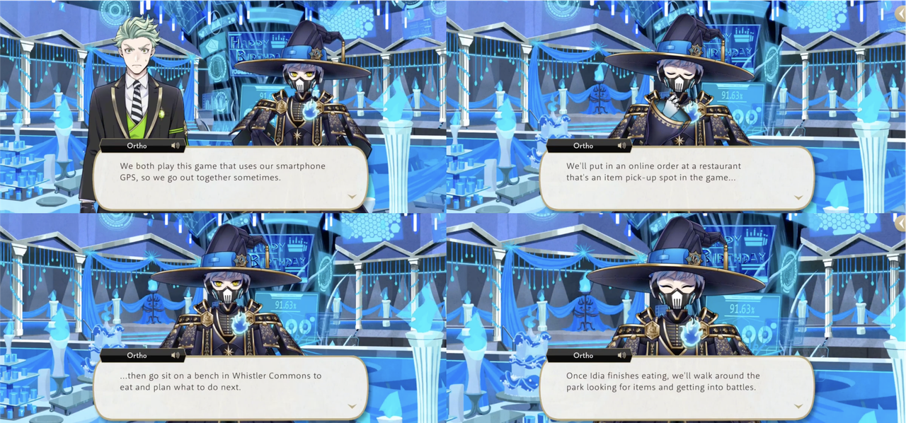 In Ortho’s third birthday vignette we learn that he has even convinced Idia to spend time outside in the Foothill Town in order to play a mobile game that incorporates their smartphone GPS.