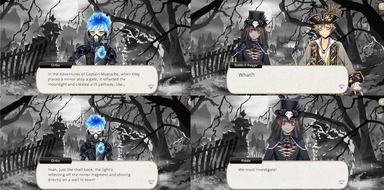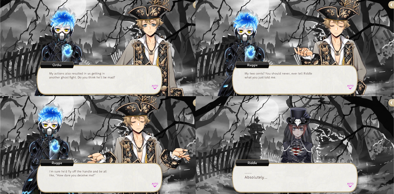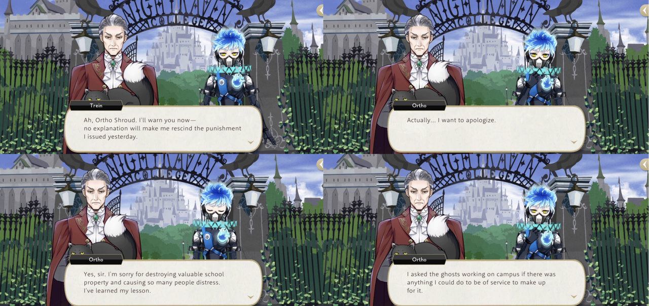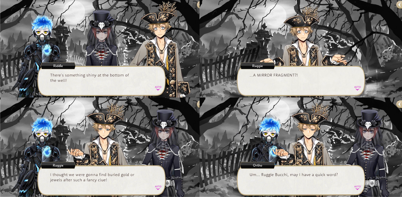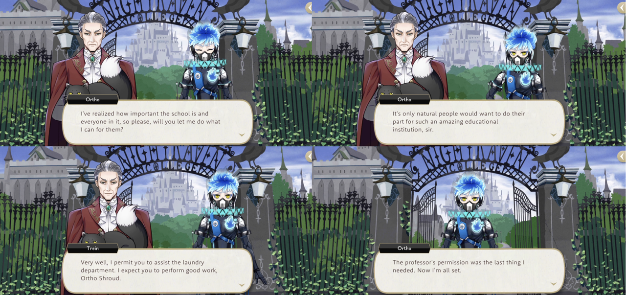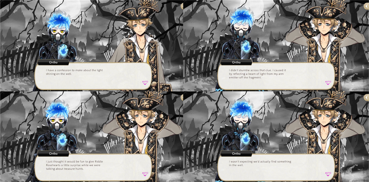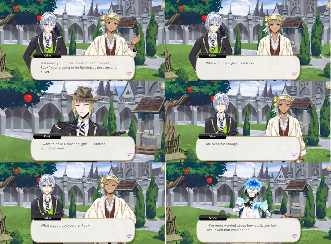 Ortho seems more suspicious of those around him than Kalim and Silver: prior to Beanfest Rook says that he is advising members of the opposite team because he wants to “have a most delightful Beanfest, with all of you!” and Silver and Kalim respond with, “sensible enough”, “What a good guy you are, Rook!”, while Ortho says, “I’m more worried about how easily you both swallowed that explanation…”