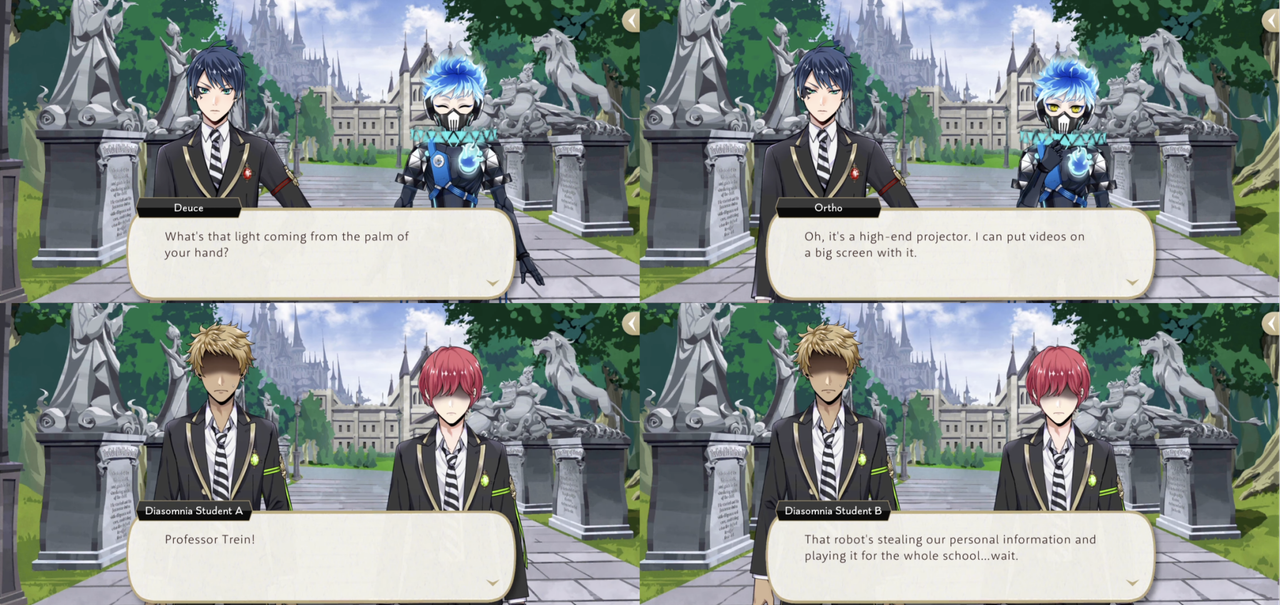 Ortho has been programmed to be able to lie. After a pair of bullies insult Idia he lies to Trein, setting up a screen on the Main Street of the school to project embarrassing videos of the bullies in revenge and then pretending otherwise.
