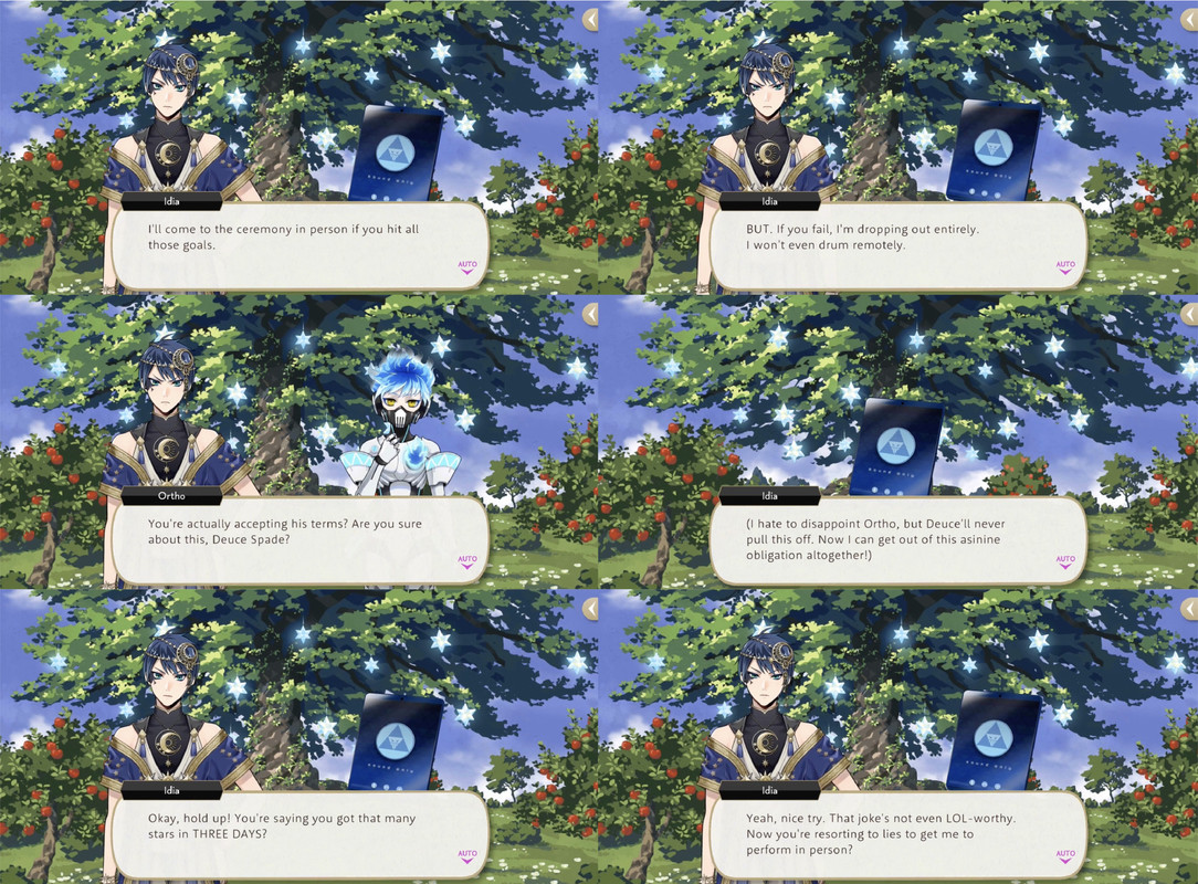 Ortho tries his best to get Idia excited about the event but Idia ends up begging to be excused from the obligation to perform in public. Idia makes a bet with Deuce: if Deuce can improve his dancing, collect all his own wishing stars AND those that Idia needs to collect, then he will preform. Deuce fulfills his end of the deal and Idia finally relents.