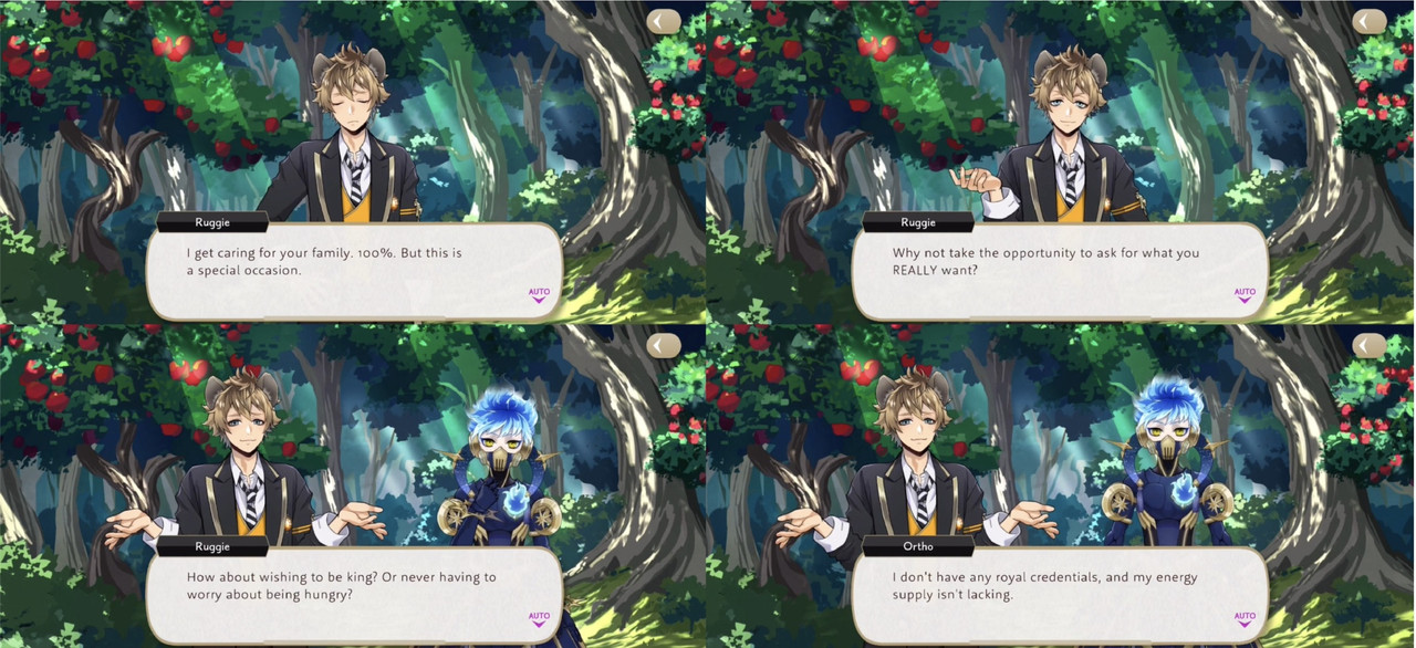 Ruggie asks why he doesn’t take the opportunity to ask for what he REALLY wants (“How about wishing to be king? Or never having to worry about being hungry?”), but Ortho decides that what he really wants is for Idia to be happy. “I want his wish to come true. I couldn’t ask for anything more.”
