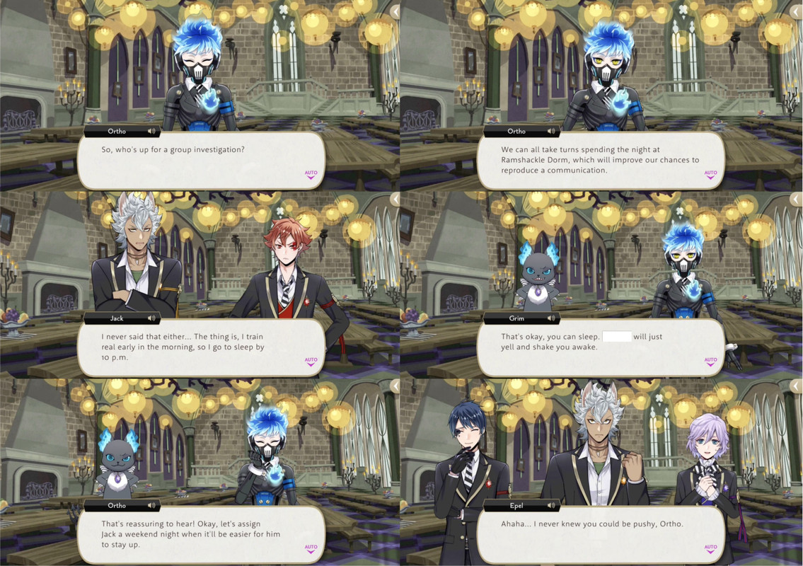 Ortho comes up with the idea of a group investigation to try and solve the mystery of the Ramshackle dorm mirror. When Jack says he goes to sleep by 10pm Grim responds that they can just yell and shake him awake, and Ortho immediately agrees. Epel says, “Ahaha…I never knew you could be pushy, Ortho.”