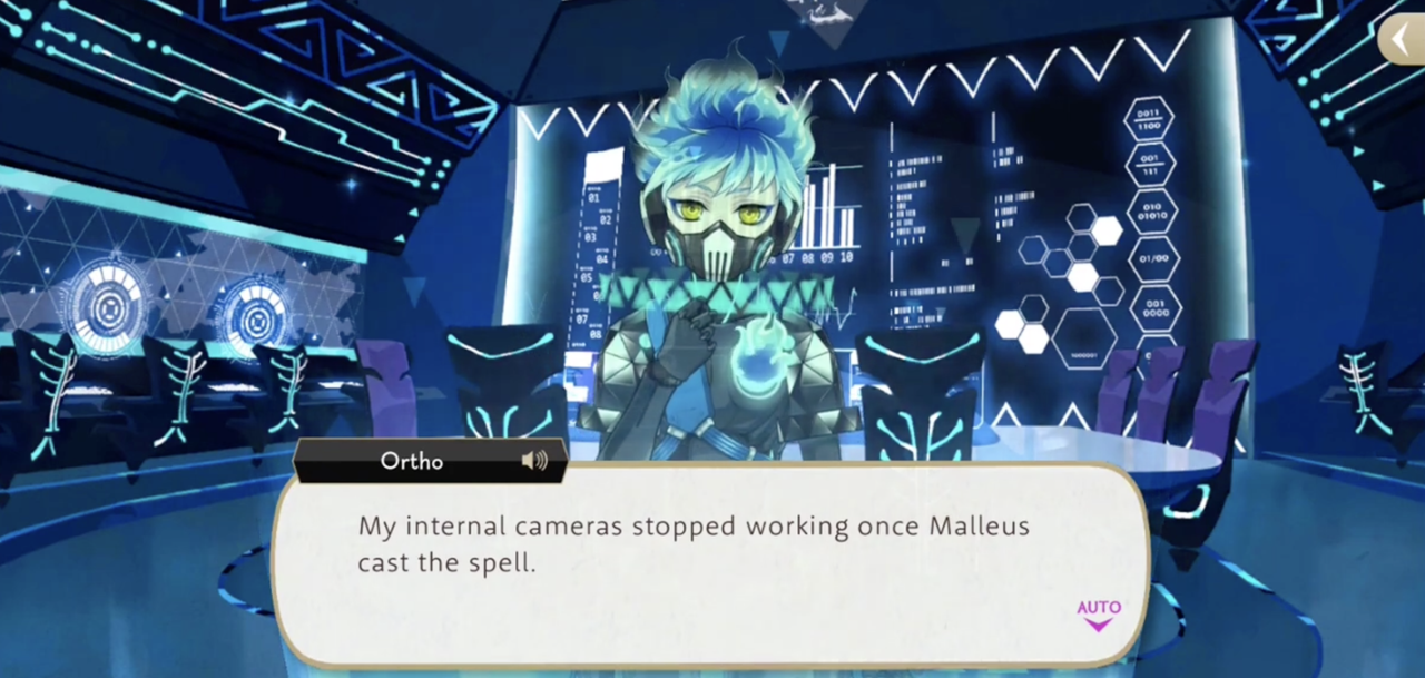 Malleus and Ortho do not interact often, and mostly in a Halloween vignette where Ortho uses his database to help Malleus decide on what Diasomnia should wear for their Halloween costumes.