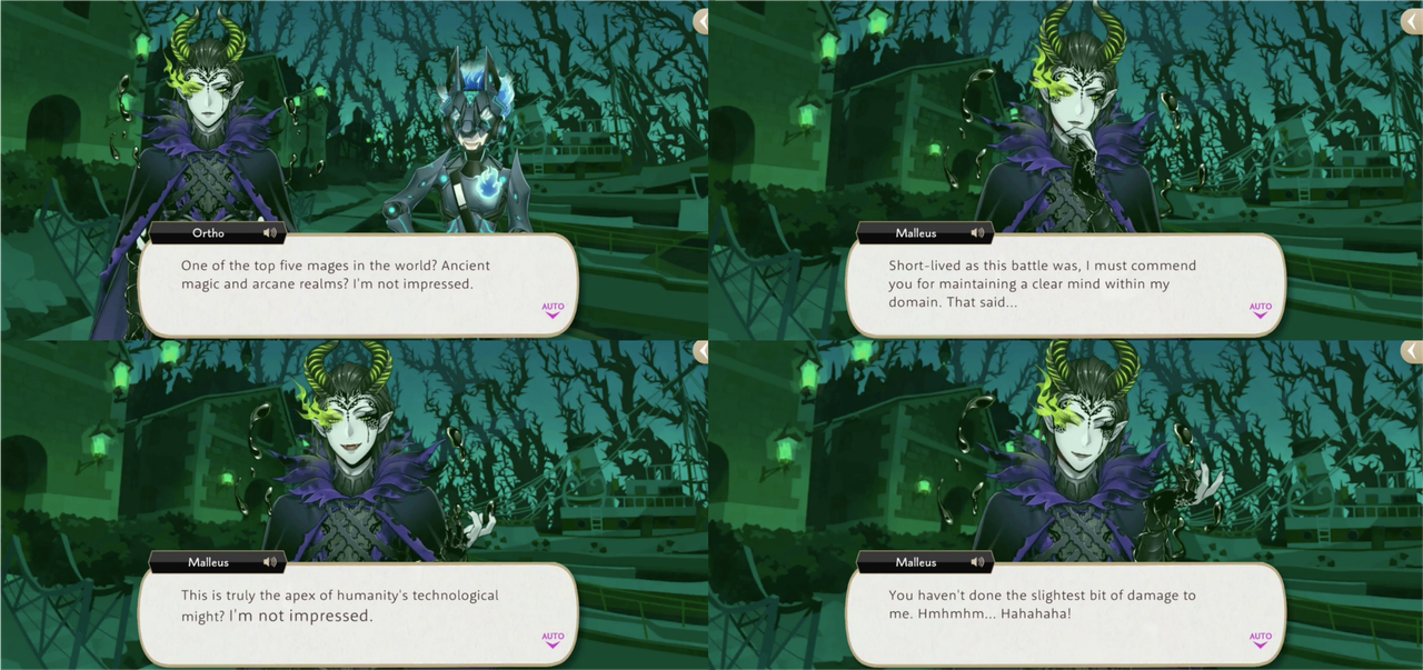 When they meet in Malleus’ domain Ortho mocks him with, “One of the top five mages in the world? Ancient magic and arcane realms? I’m not impressed,” which Malleus soon throws back at him, defeating Ortho in a battle and responding, “This is truly the apex of humanity’s technological might? I’m not impressed.”