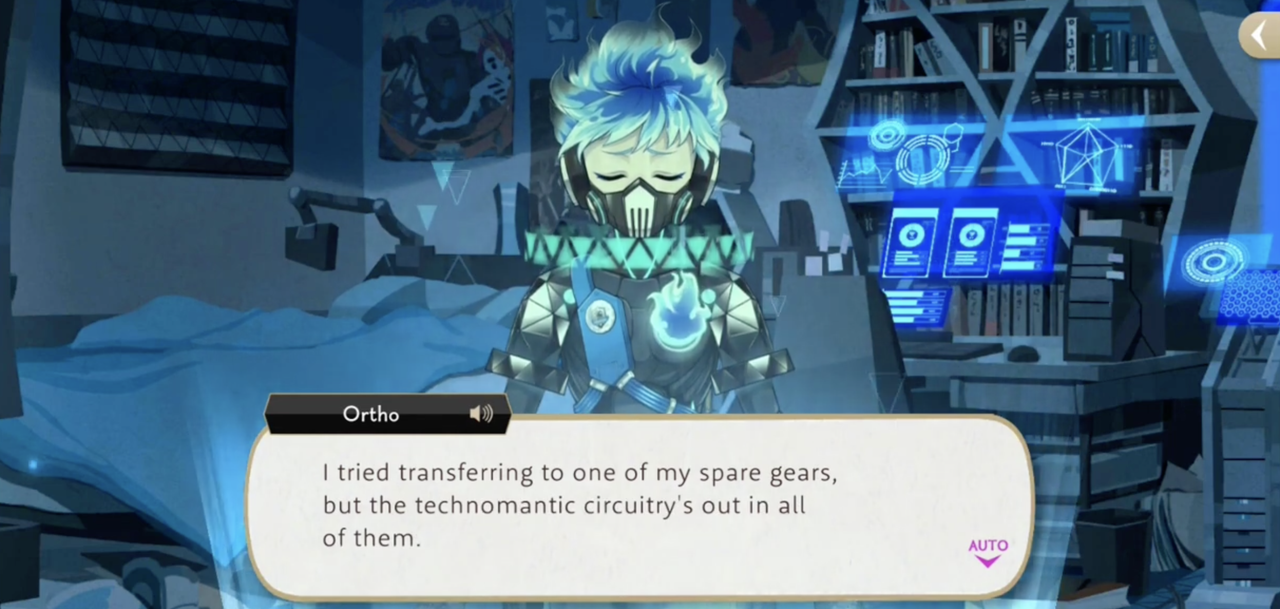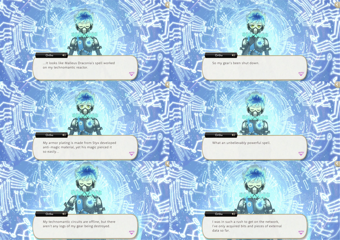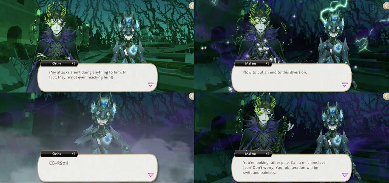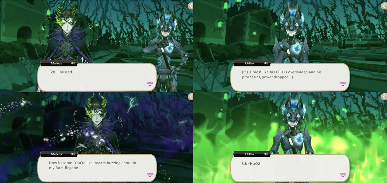 Malleus decides to obliterate Ortho, taking out one of Ortho’s Cerberus androids instead. Upon his second attempt Malleus’ attack misses and Ortho reflects, “It’s almost like his CPU is overloaded and his processing power dropped…”