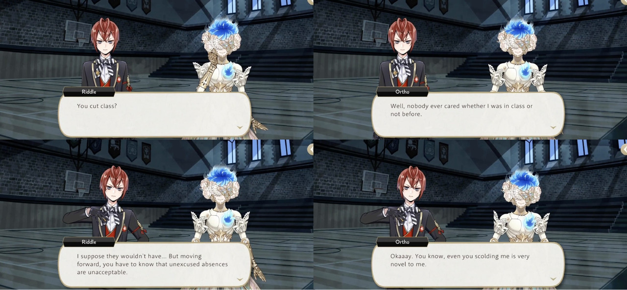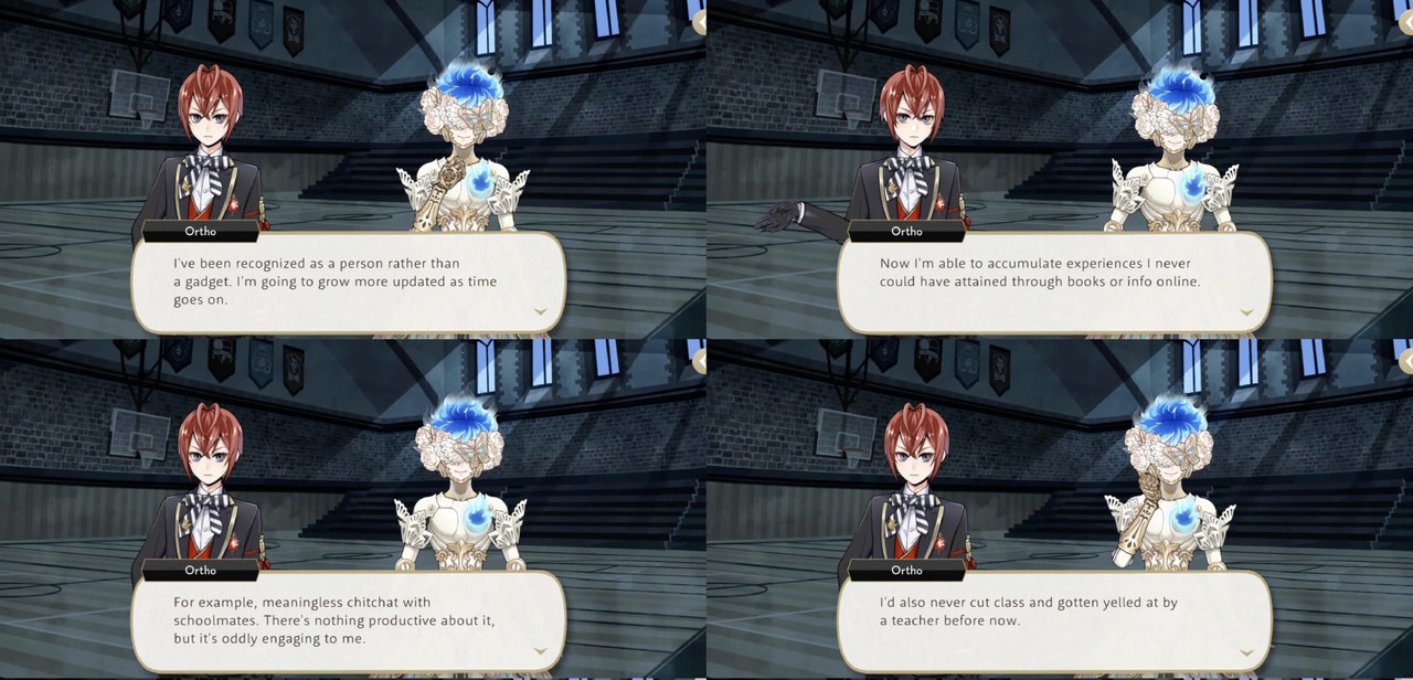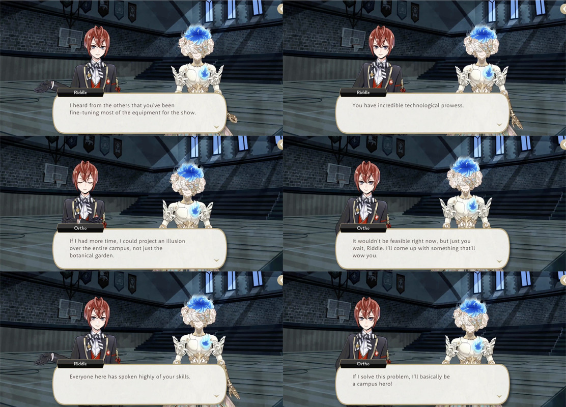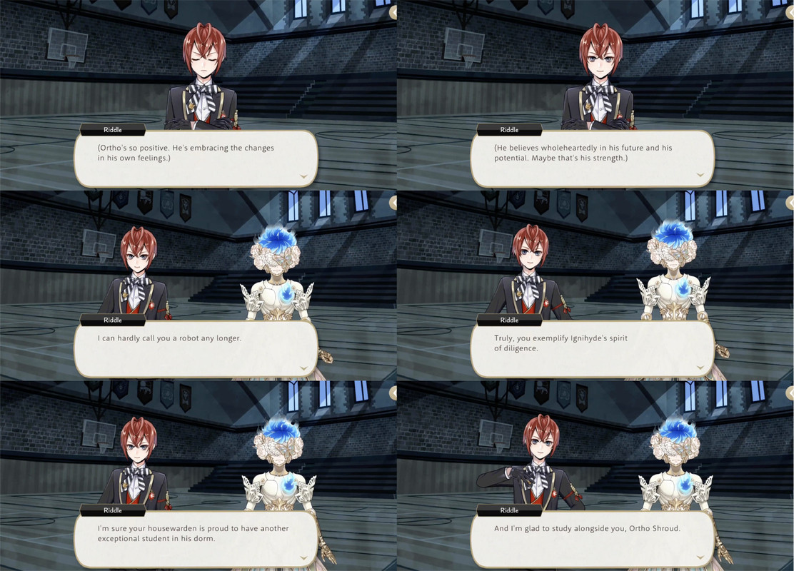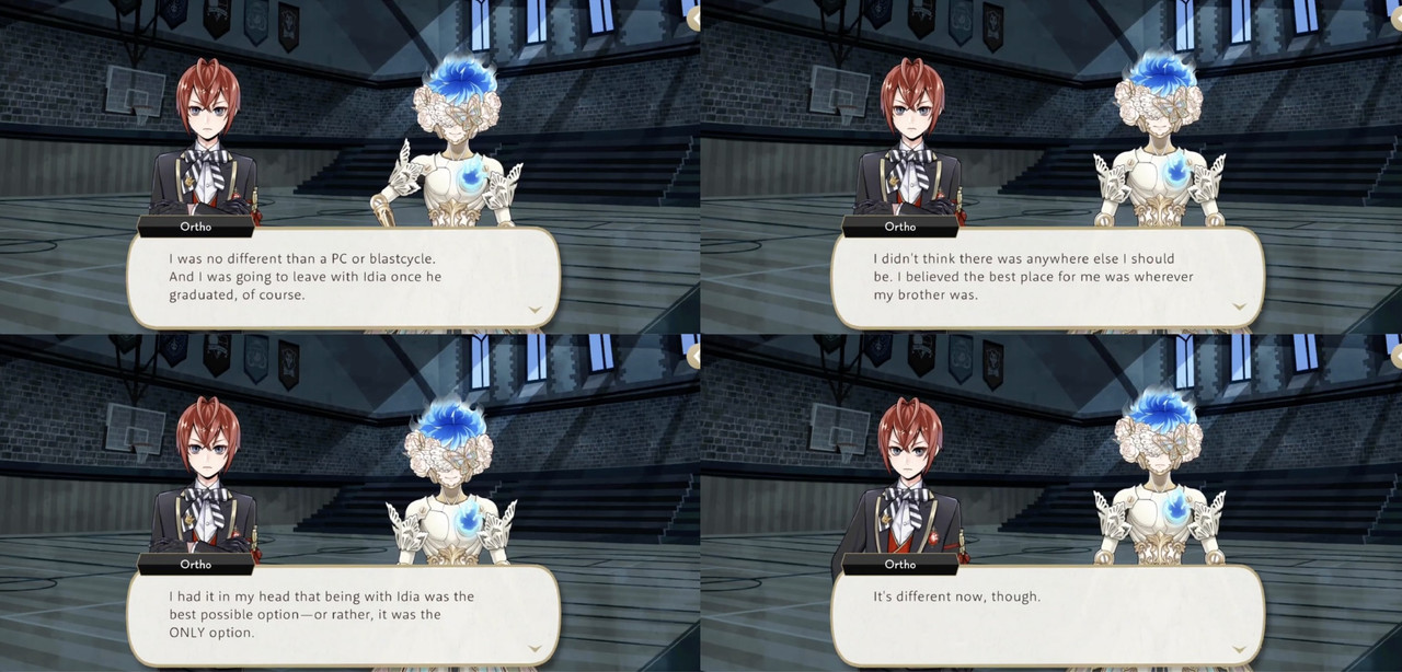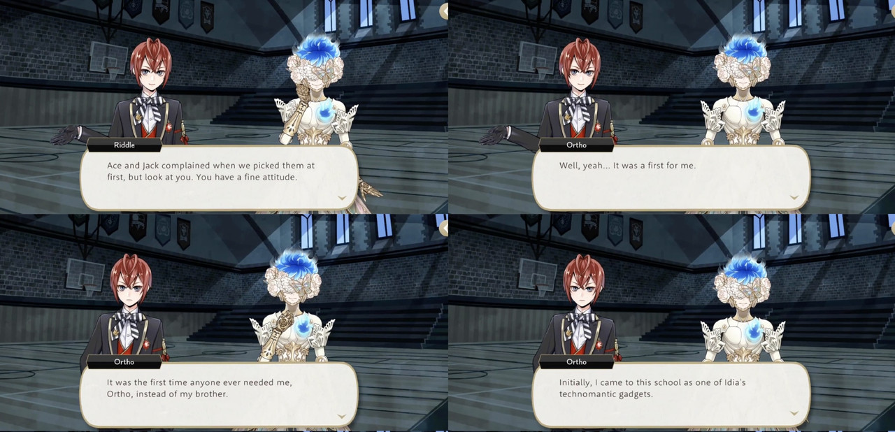 Ortho confides in Riddle that the Fairy Gala IF event is the first time that anyone has ever needed him instead of his brother: “I came to this school as one of Idia’s technomatic gadgets. I was no different than a PC or a blastcycle. And I was going to leave with Idia once he graduated…I didn’t think there was anywhere else I should be. I believed the best place for me was wherever my brother was. I had it in my head that being with Idia was the best possible option—or rather, it was the ONLY option. It’s different now, though. I’ve been recognized as a person rather than a gadget.”