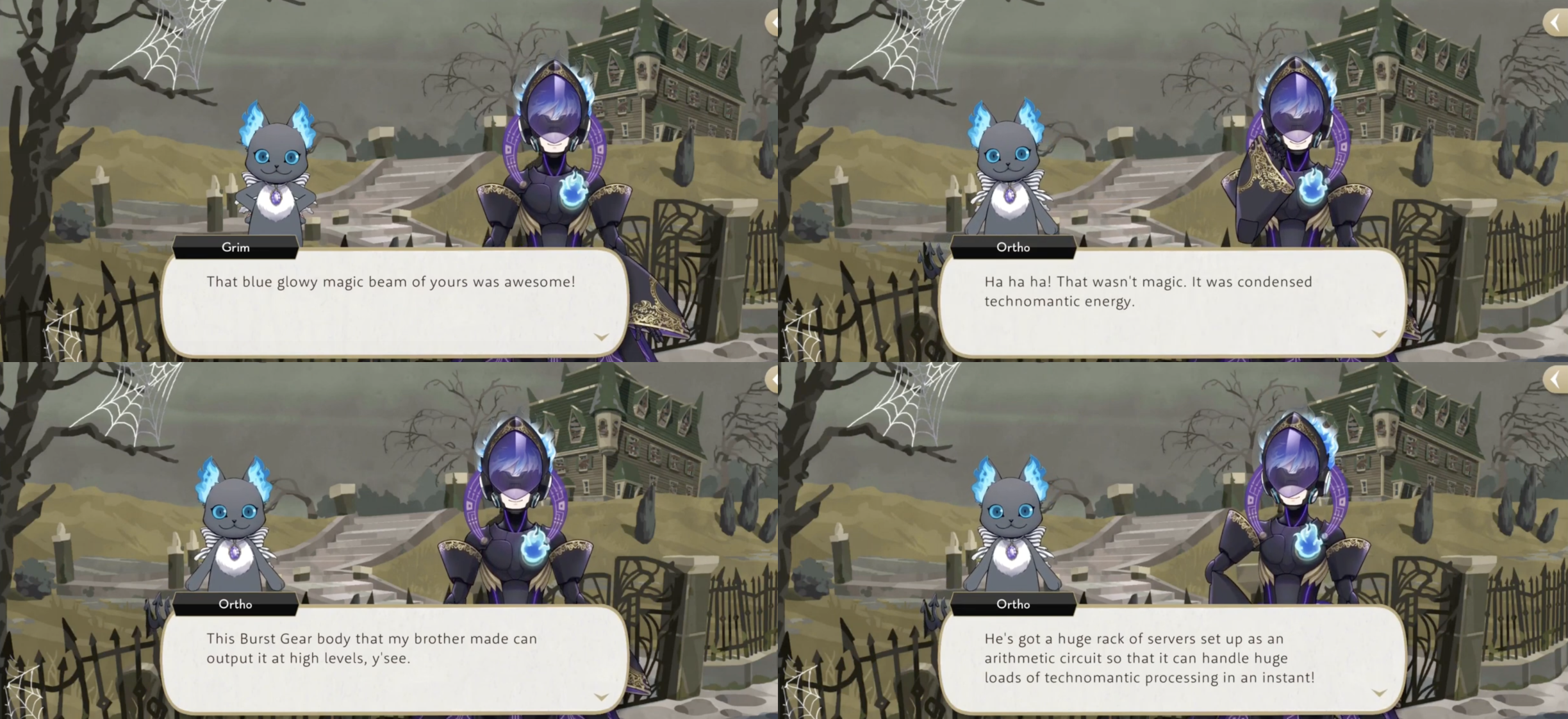 He says that technomantic energy can be described in layman’s terms as “a hybrid of magic and electrical power,” but when Grim comments on a “blue glowy magic beam” that Ortho can produce (his technomantic cannon) Ortho responds, “that wasn’t magic. It was condensed technomantic energy.”