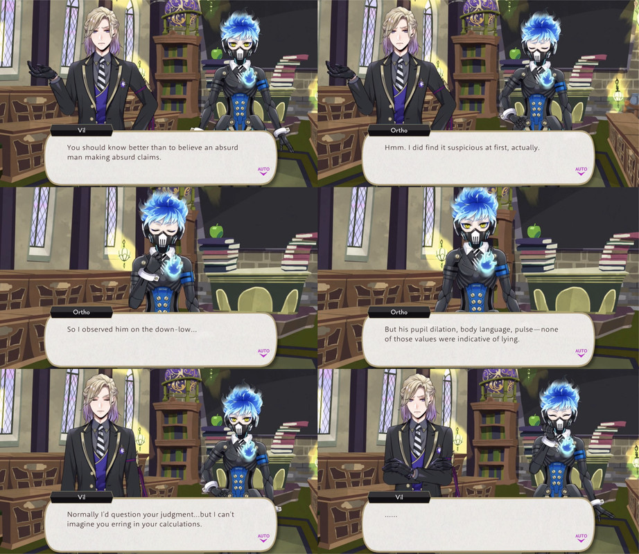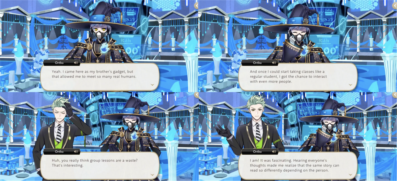 Ortho explains that he first came to the school as Idia’s “gadget,” but now he interacts with humans, and “hearing everyone’s thoughts made me realize that the same story can read so differently depending on the person. Because of their values.”
