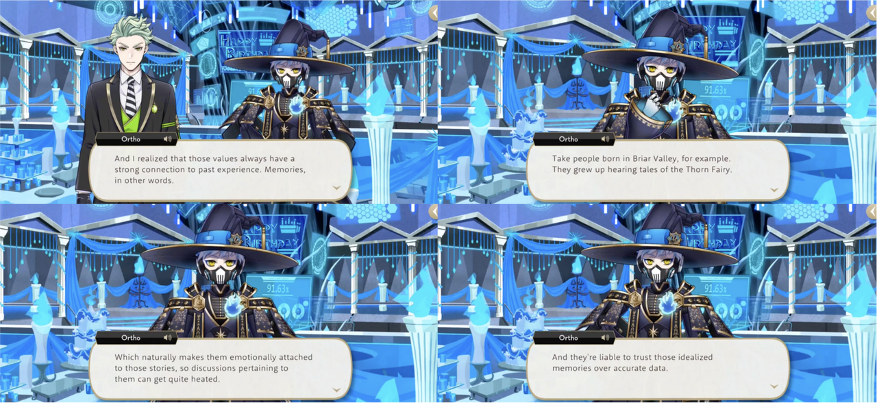 Ortho uses the example of the Thorn Fairy, saying that people who grew up in Briar Valley are so emotionally attached to stories about her that they are liable to trust idealized memories over accurate data.