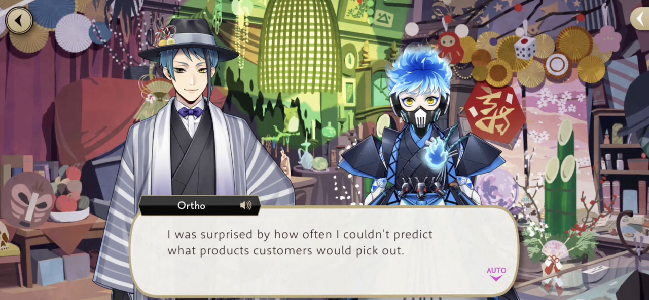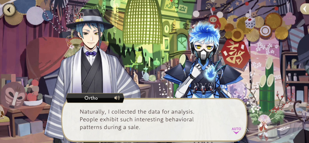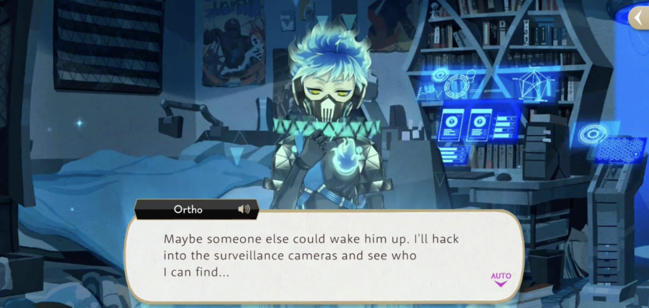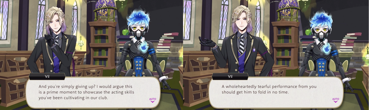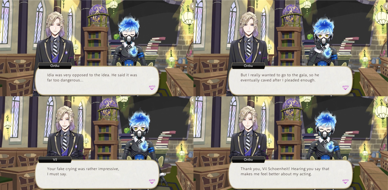 Ortho was programmed to lie even pre-book-6, and this is an ability that came with him when he was reborn: Vil encourages him to showcase the acting skills he has been cultivating in the film research club by giving a “wholeheartedly tearful performance” that will convince Idia to go to Playfulland with him.