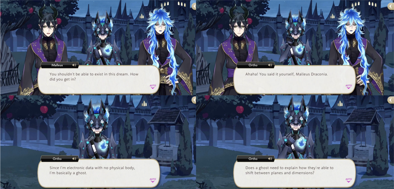 When Ortho infiltrates Idia’s dream in his Cerberus gear and Malleus asks how he managed it Ortho responds, “Does a ghost need to explain how they’re able to shift between planes and dimensions?”