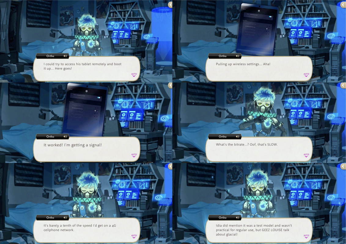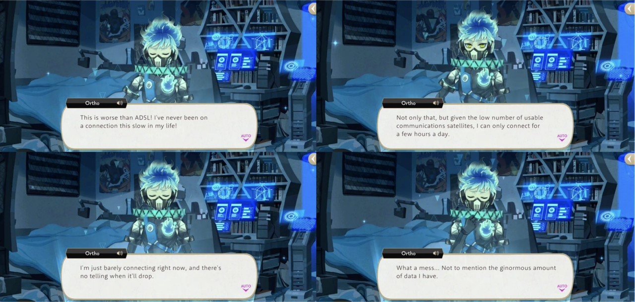 Ortho accesses Idia’s tablet remotely in an attempt to escape from Malleus’ domain, but there are limitations: he can only connect for a few hours a day given the low number of usable communications satellites, and he can move at barely a tenth of the speed he gets on 4G networks.