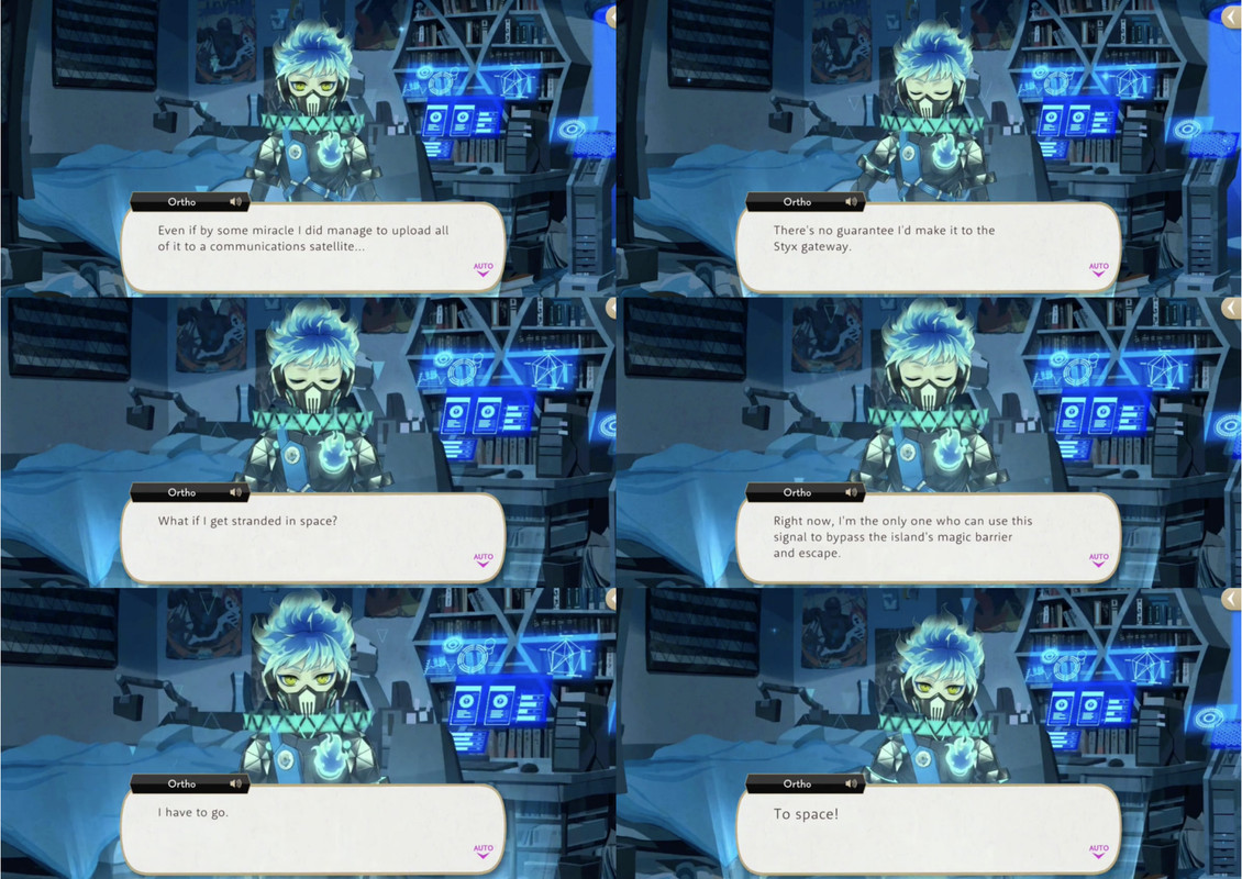The transfer is also extremely risky, with the threat of Ortho becoming stranded in space between the island and the satellite, or between the satellite and STYX.
