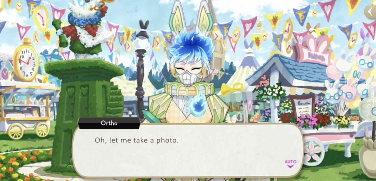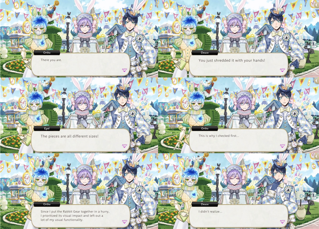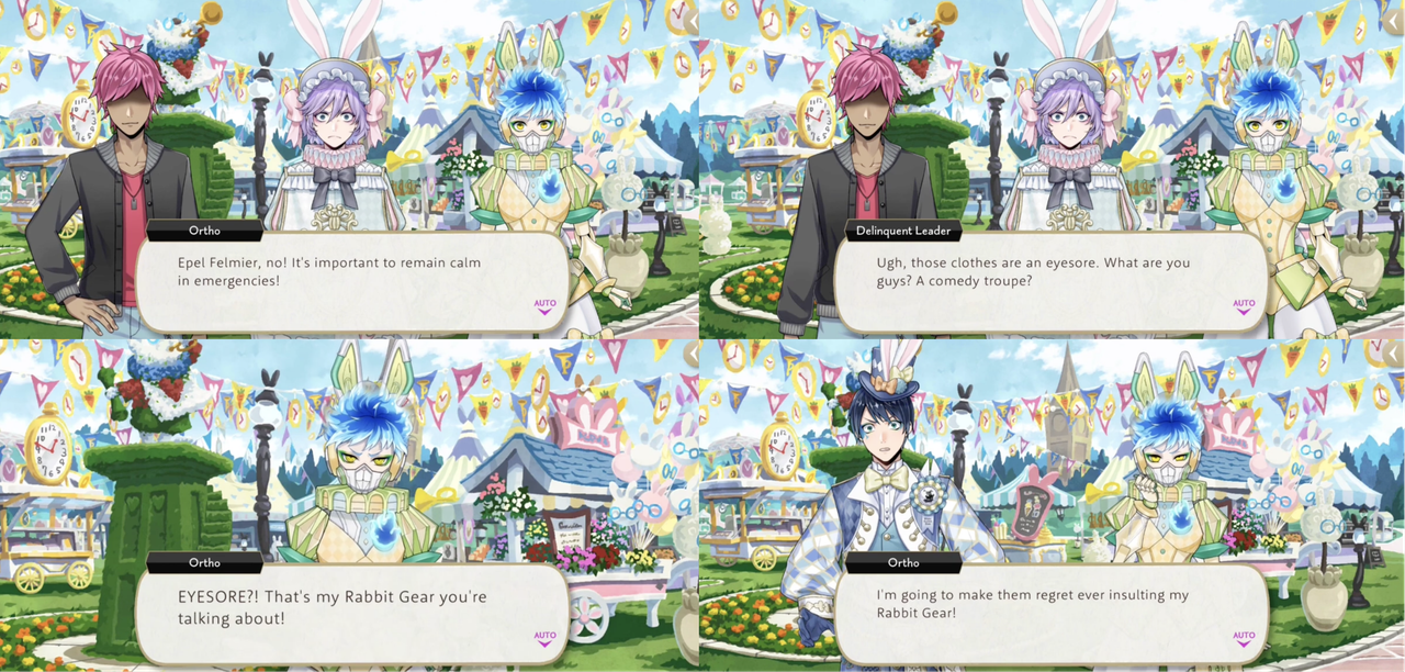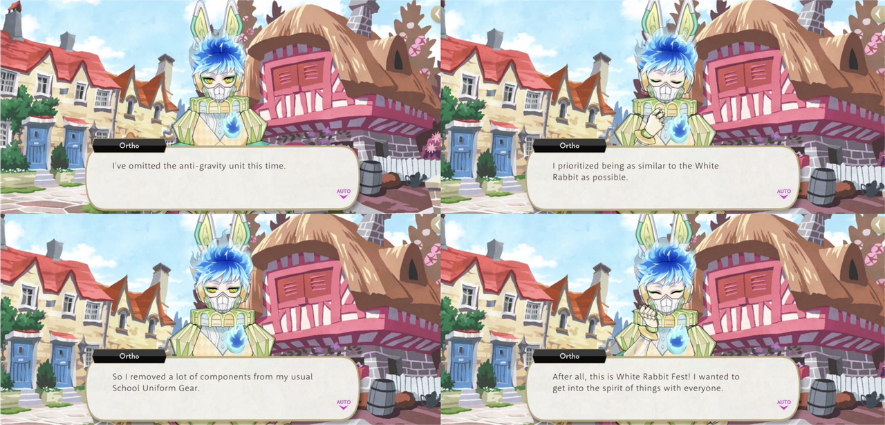 After telling Epel that it is important to remain calm in emergencies Ortho becomes enraged at an insult to his Rabbit Gear, and making the bully regret his insult becomes his driving motivation for the Rabbit Run race during the White Rabbit Fes event.