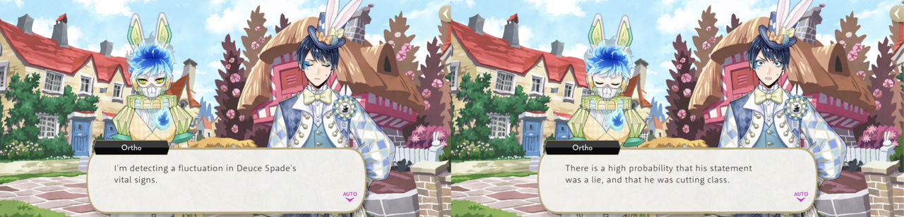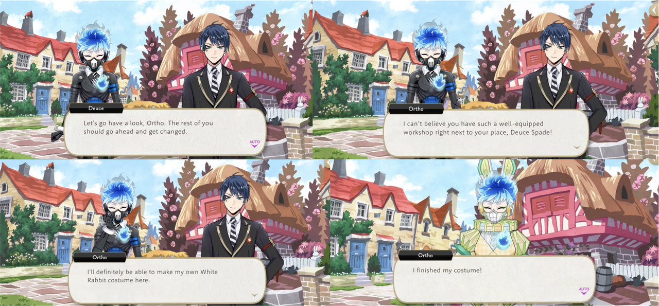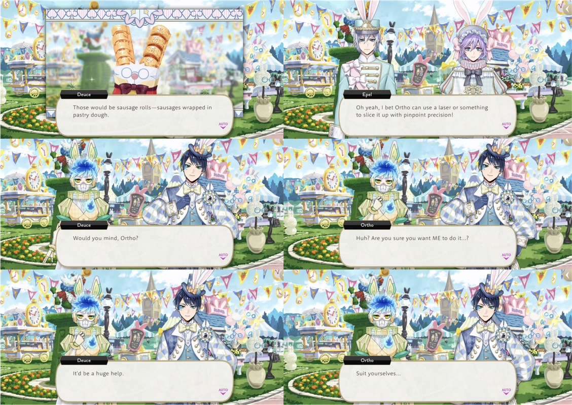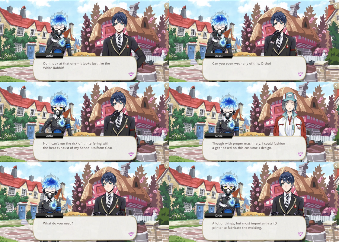 Ortho is unable to wear any of the White Rabbit costumes provided by Deuce’s mother, saying that he would need proper machinery with a 3D printer.