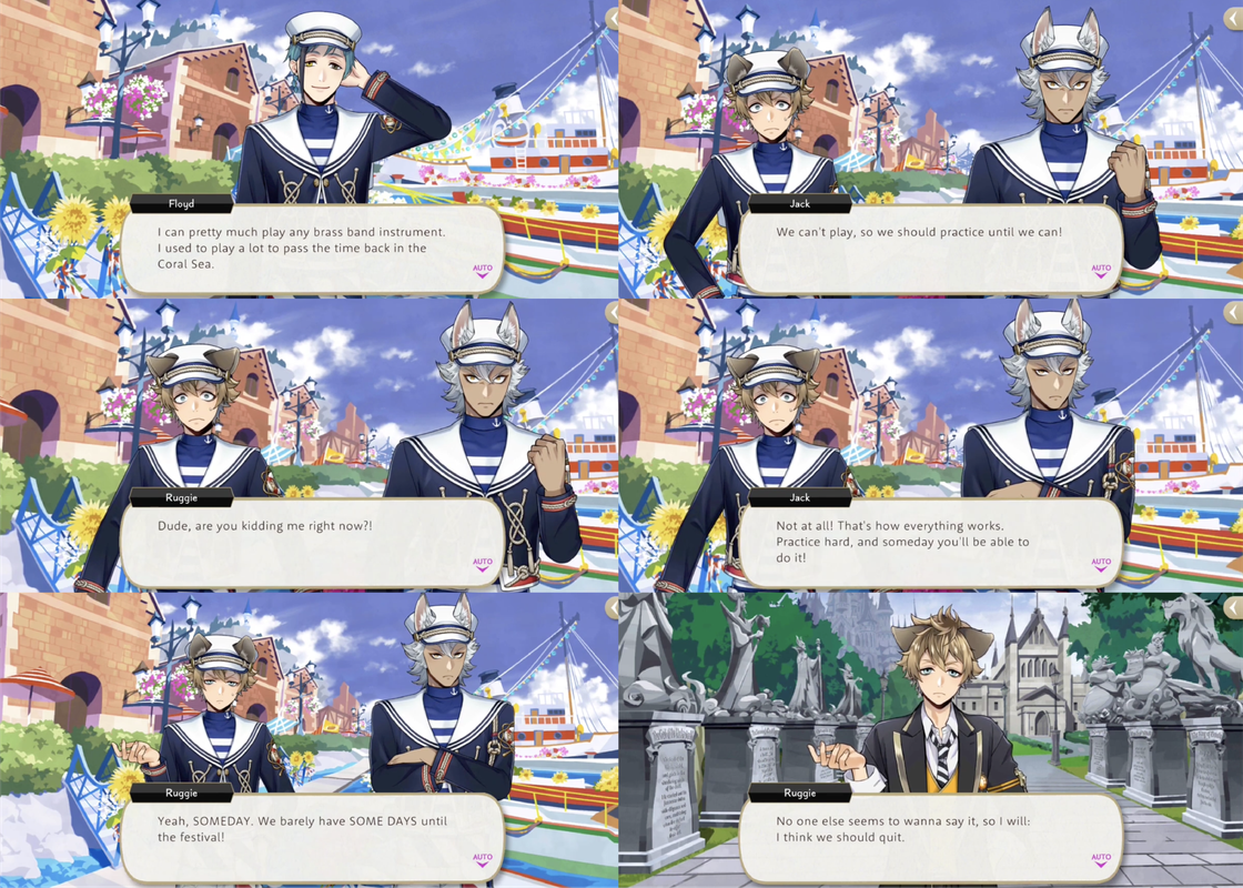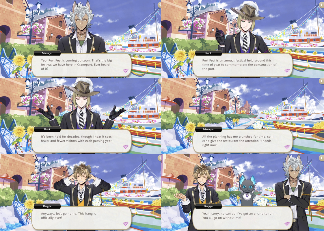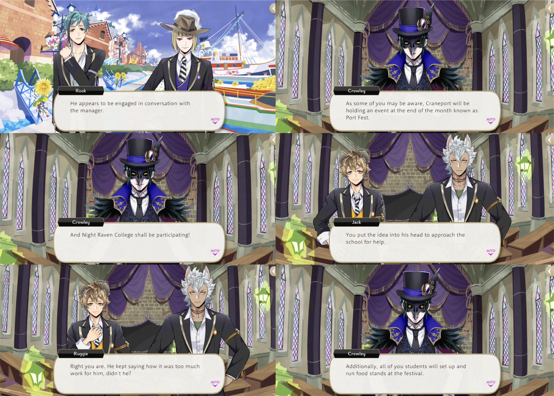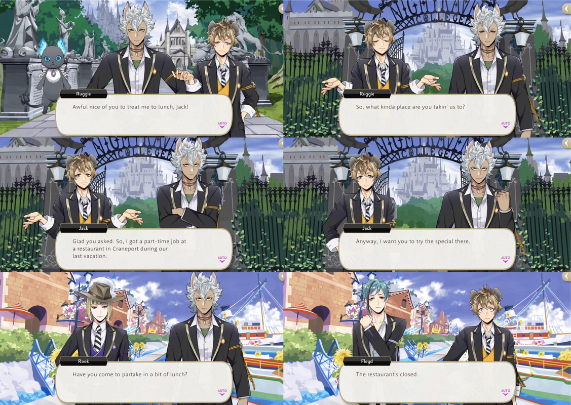 Ruggie sends Jack and the rest of the group away (they met with Floyd and Rook by coincidence) to speak with the manager alone, and it is later revealed that he gave the manager the idea for the students of Night Raven College to help with festival preparations.