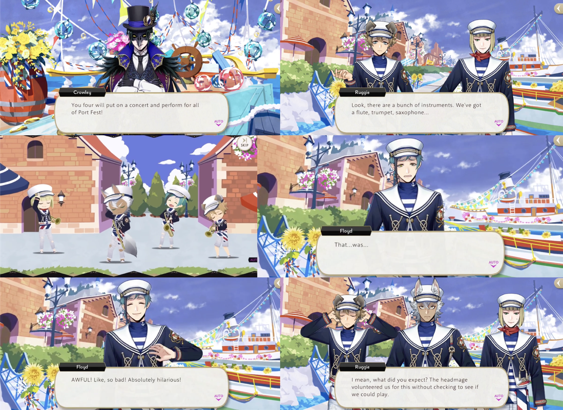 Crowley has Crewel design special Port Wear outfits for the four students and reveals that they are to put on a musical performance during the festival. The students are provided with various brass instruments, but Floyd is the only one with any experience.
