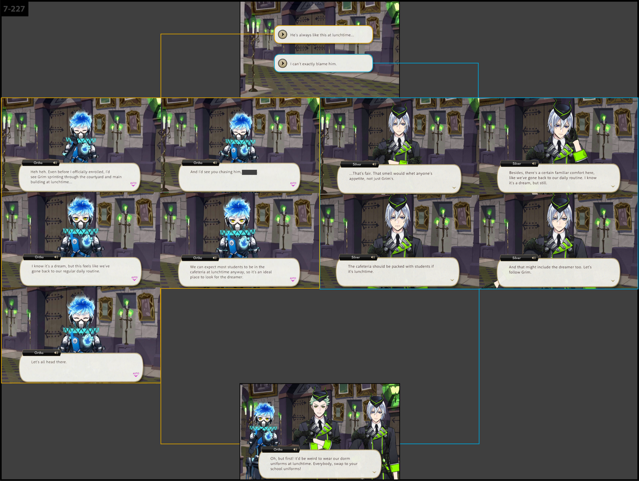 Silver: …that’s fair. That smell would whet anyone’s appetite, not just Grim’s. Besides, there’s a certain familiar comfort here, like we’ve gone back to our daily routine. I know it’s a dream, but still. The cafeteria should be packed with students if it’s lunchtime. And that might include the dreamer too. Let’s follow Grim.