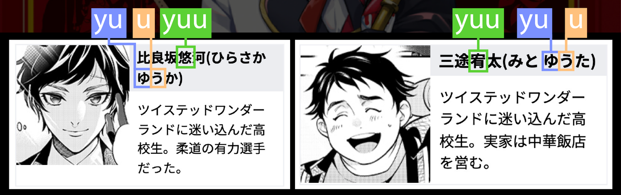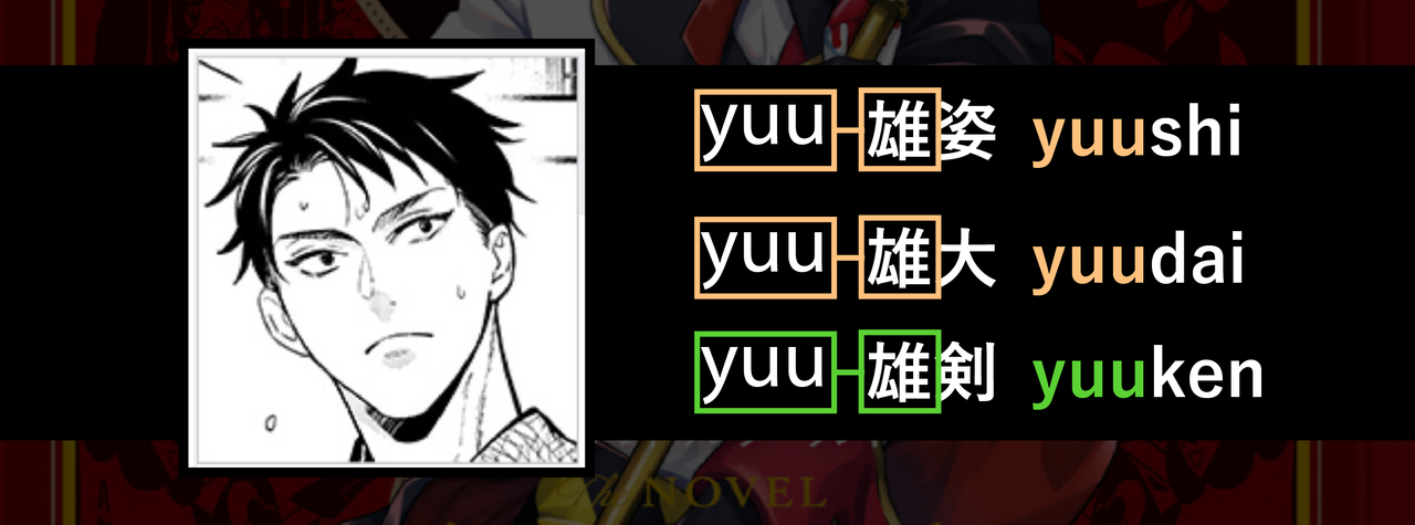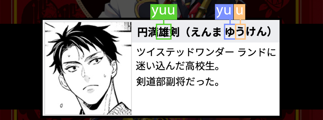 For Yuuken’s name we have kanji that is also being read with with another “u” sound after “yu,” according to the hiragana.